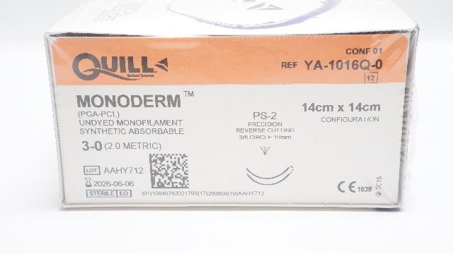 - Quill YA-1016Q-0 3-0 Monoderm PS-2 Precision Reverse Cutting 3/8c 19mm-Box of 12