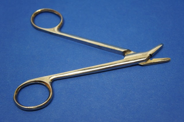 General characteristics item description: cres material; 4.750 (120.65 mm) o/a length; blunt blade point; angled to one side shape; one serrated blade; 15mm blade length; short; surgical instrument for cutting wire sutures and wire mesh; unit issue ea
