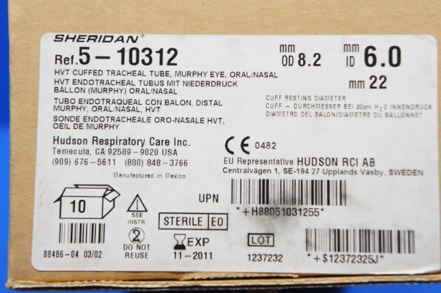 - Sheridan 5-10312 HVT Cuffed Tracheal Tube, Murphy Eye 6.0 ID (x) ~ Box of 5