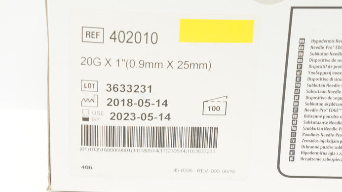- Smiths Medical 402010 Jelco EDGE Safety Device 20G x 1inch (x) - Box of 100