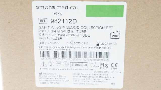 - Smiths Medical 982112D Safety-T-Wing Blood Collection Set 21Gx3/4in - Box of 200