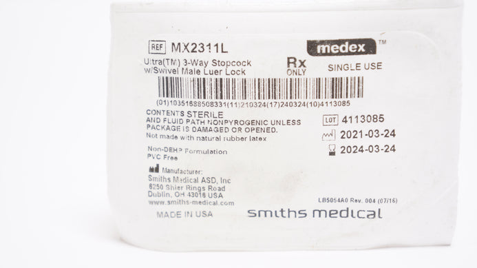 - Smiths Medical MX2311L Medex Ultra(TM) 3-Way Stopcock w/Swivel Male Luer Lock