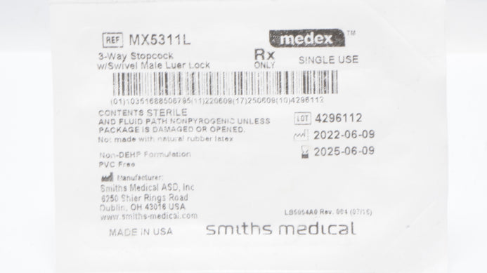 - Smiths Medical MX5311L Medex 3-Way Stopcock w/Swivel Male Luer Lock (x)