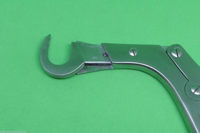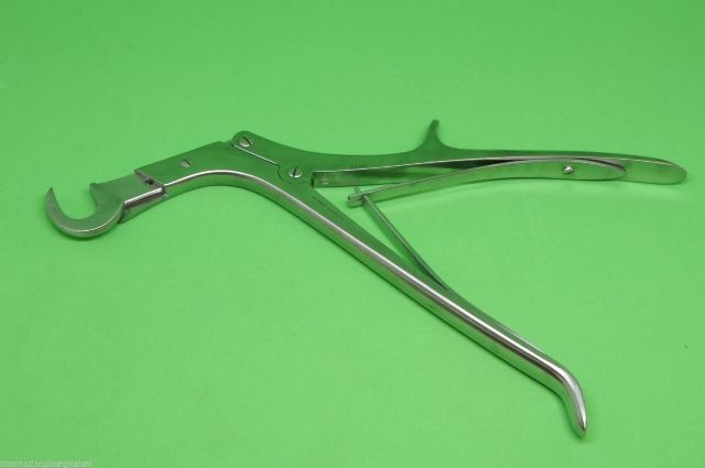Special features: proximal end permanently pleated and at a right angle to the handle; crescent shape distal end to facilitate guillotine action of bade on rib