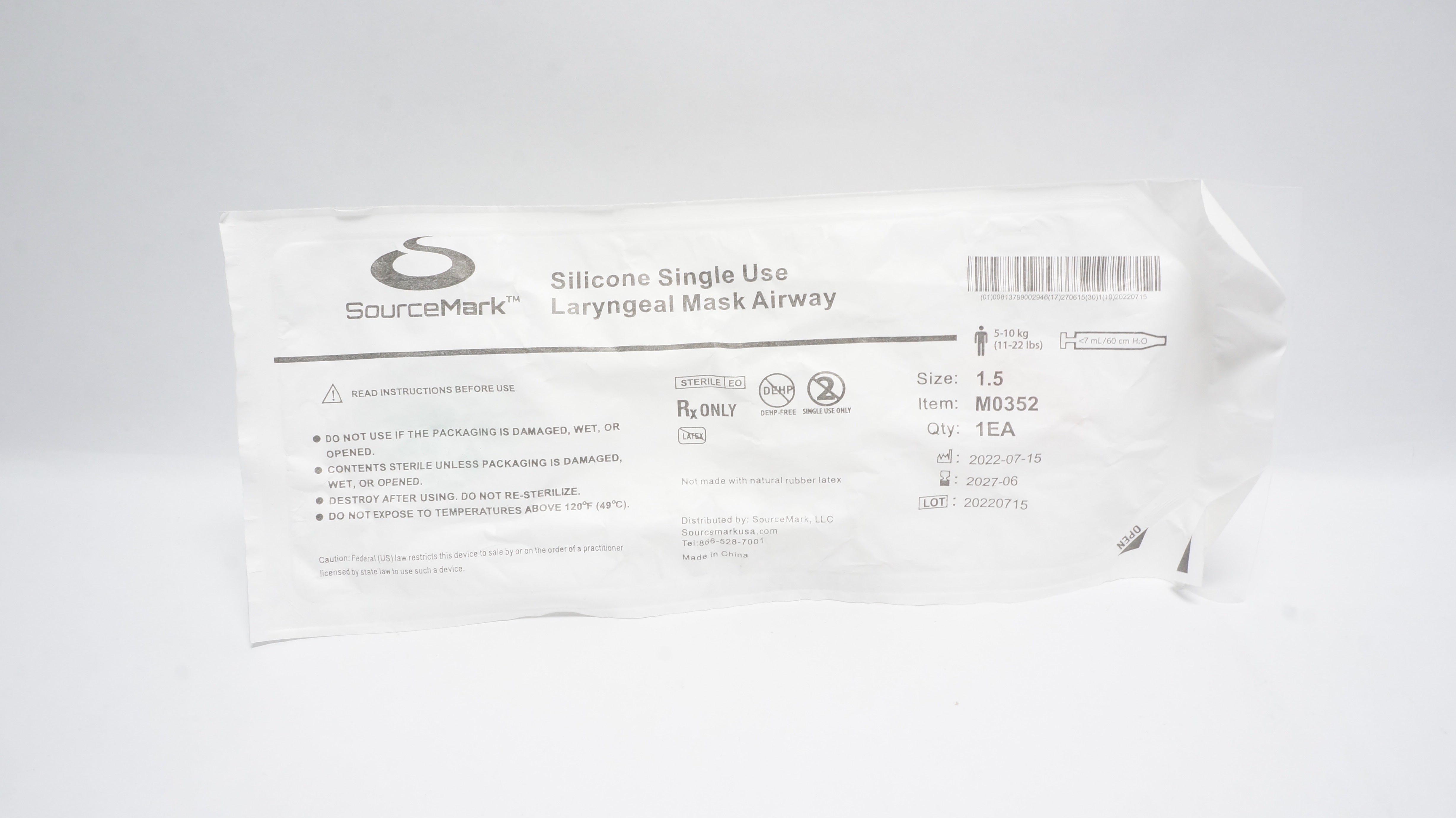 SourceMark M0352 Silicone Laryngeal Mask Airway Size:1.5 5-10kg <7mL/60cm H2O