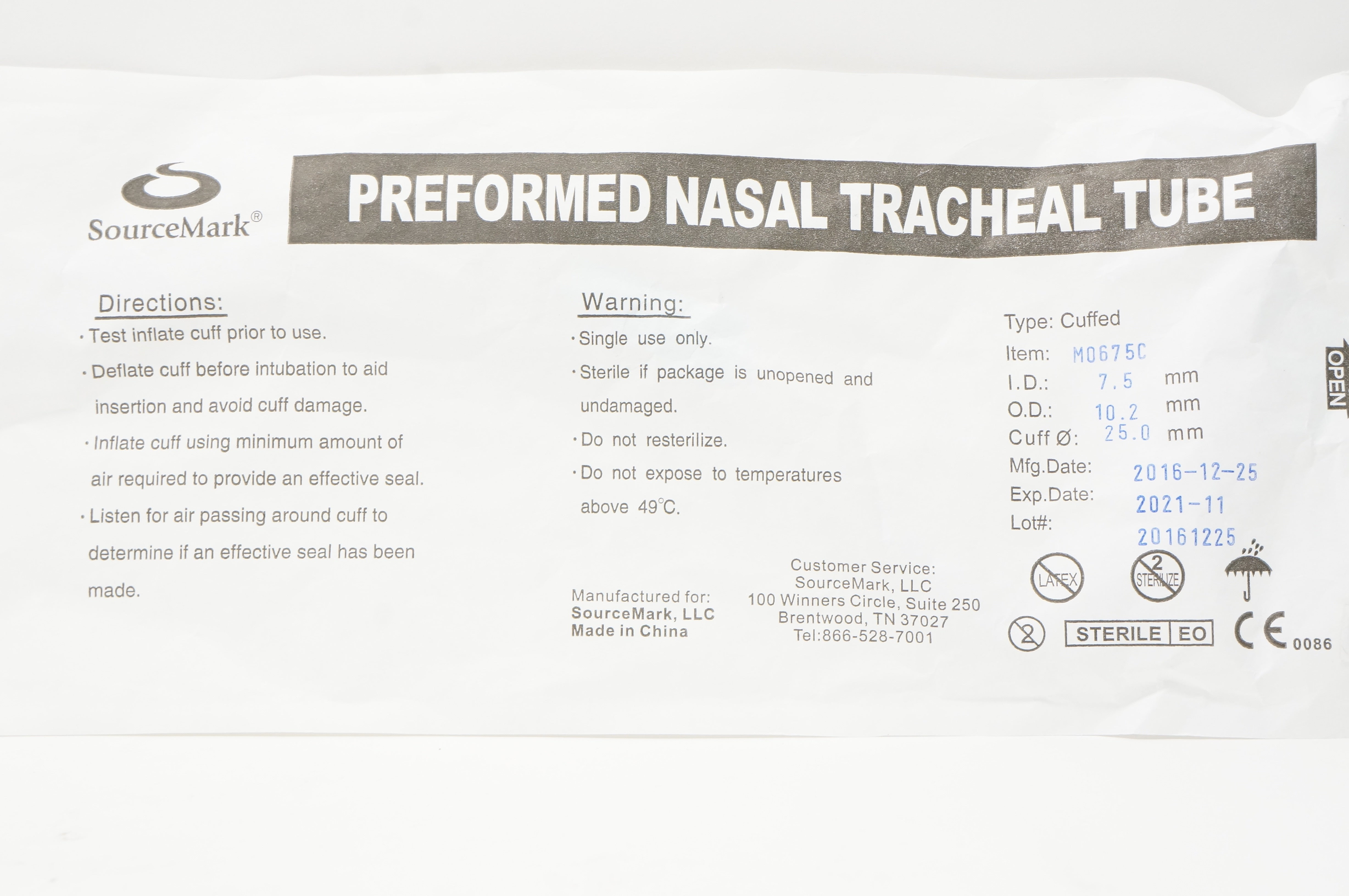 SourceMark M0675C Preformed Nasal Tracheal Tube 7.5mm x 10.2mm (x)