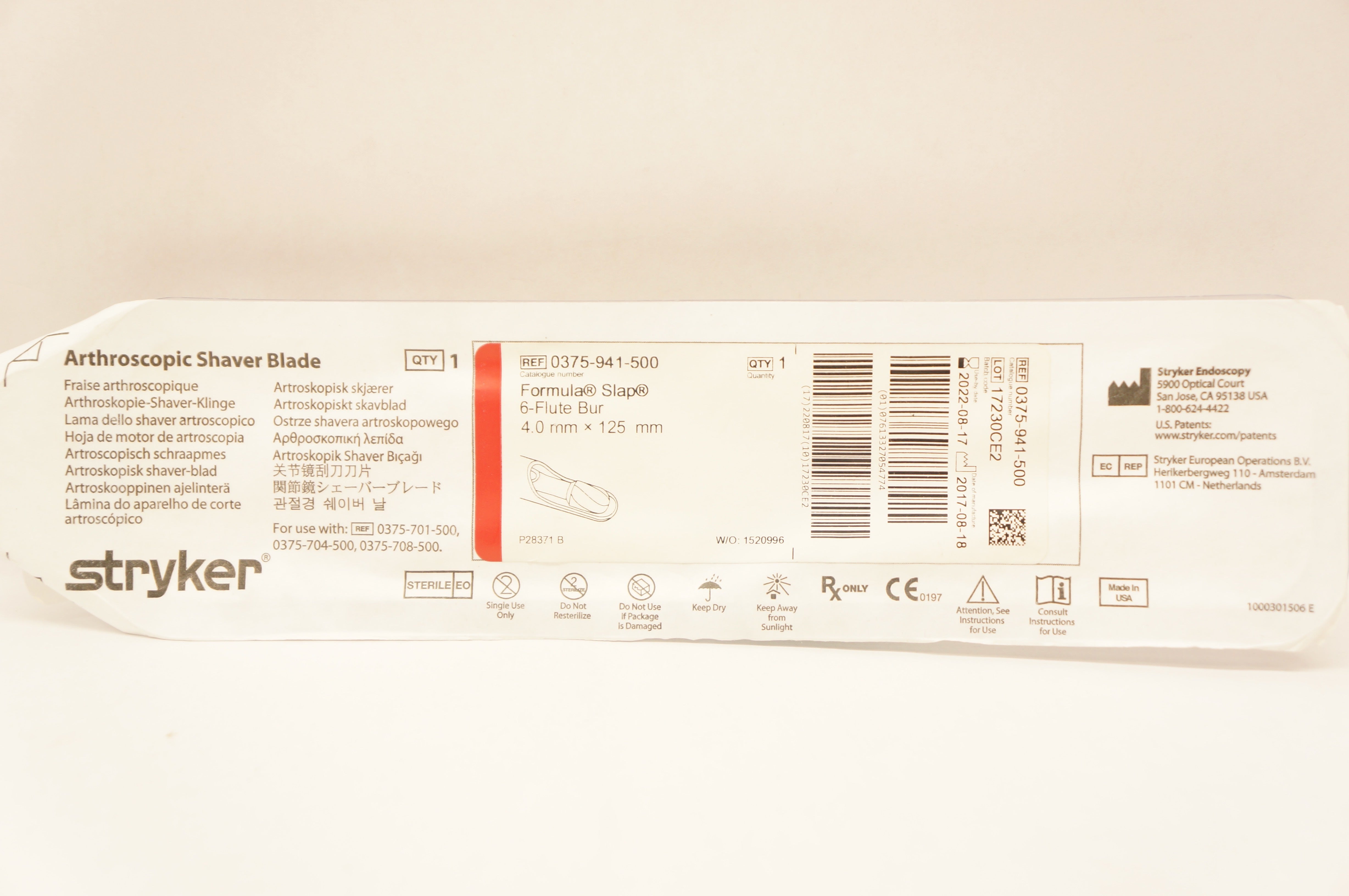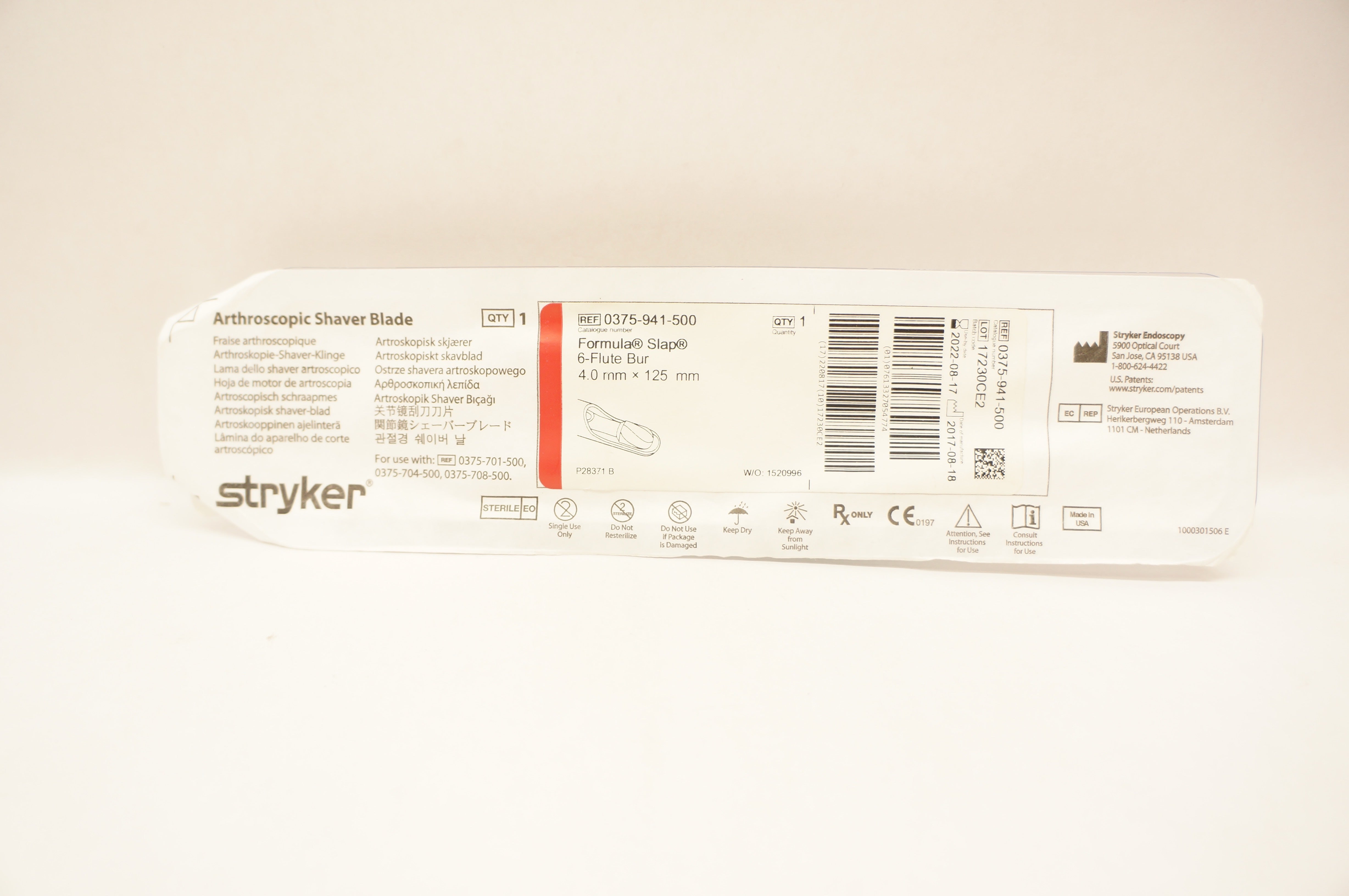 - Stryker 0375-941-500 Formula Slap 6-Flute Bur 4.0mm x 125mm (x)