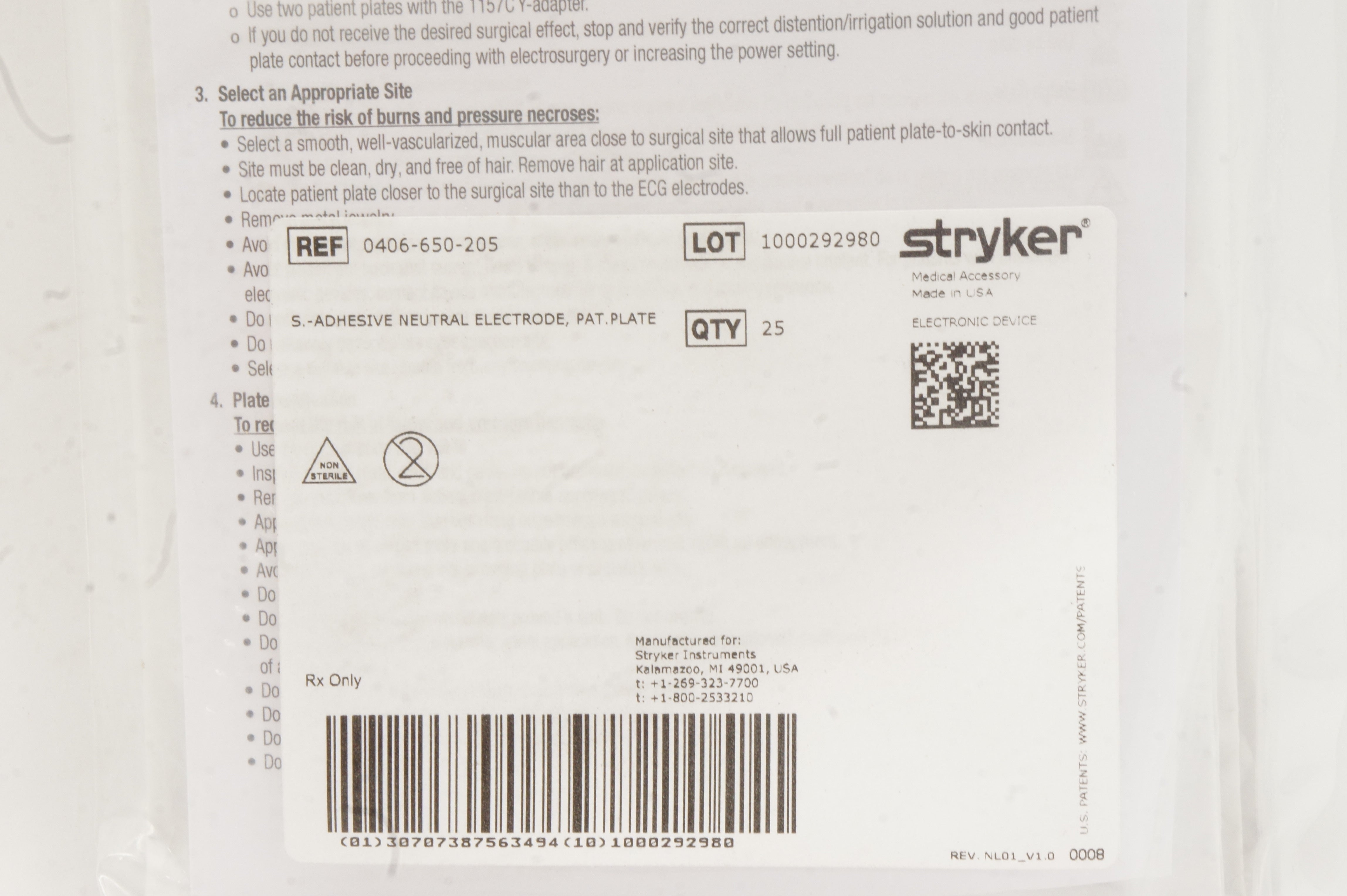 Stryker 0406-650-205 S-Adhesive Neutral Electrode Pat Plate - Pack of 25 (x)