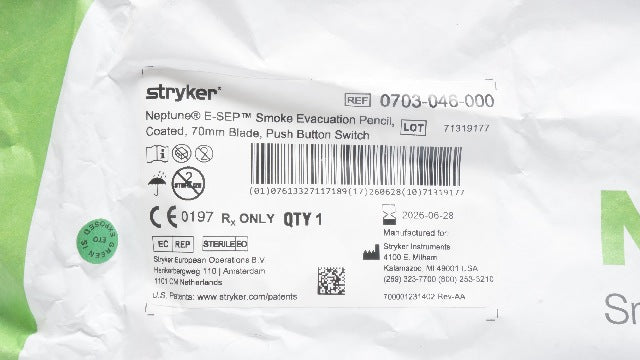 Stryker 0703-046-000 Neptune E-SEP Smoke Evacuation Pencil Coated, Blade 70mm, Push Button Switch