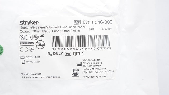 Stryker 0703-046-000 Neptune SafeAir Smoke Evacuation Pencil Coated, Blade 70mm, Push Button Switch