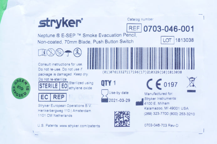 - Stryker 0703-046-001 Neptune E-SEP Smoke Evacuation Pencil, Push Button, 70mm