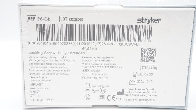 Stryker 1896-4034S Locking Screw, Fully Threaded 4 x 34mm
