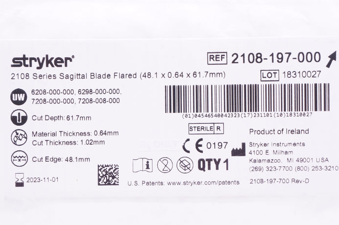 Stryker 2108-197-000 2108 Series Sagittal Blade Flared 48.1 x 0.64 x 61.7mm