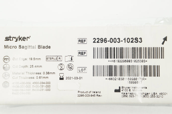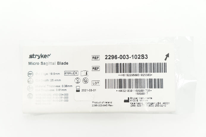 - Stryker 2296-003-102S3 Micro Sagittal Blade 19.5mm x 25.4mm x 0.38mm (x)