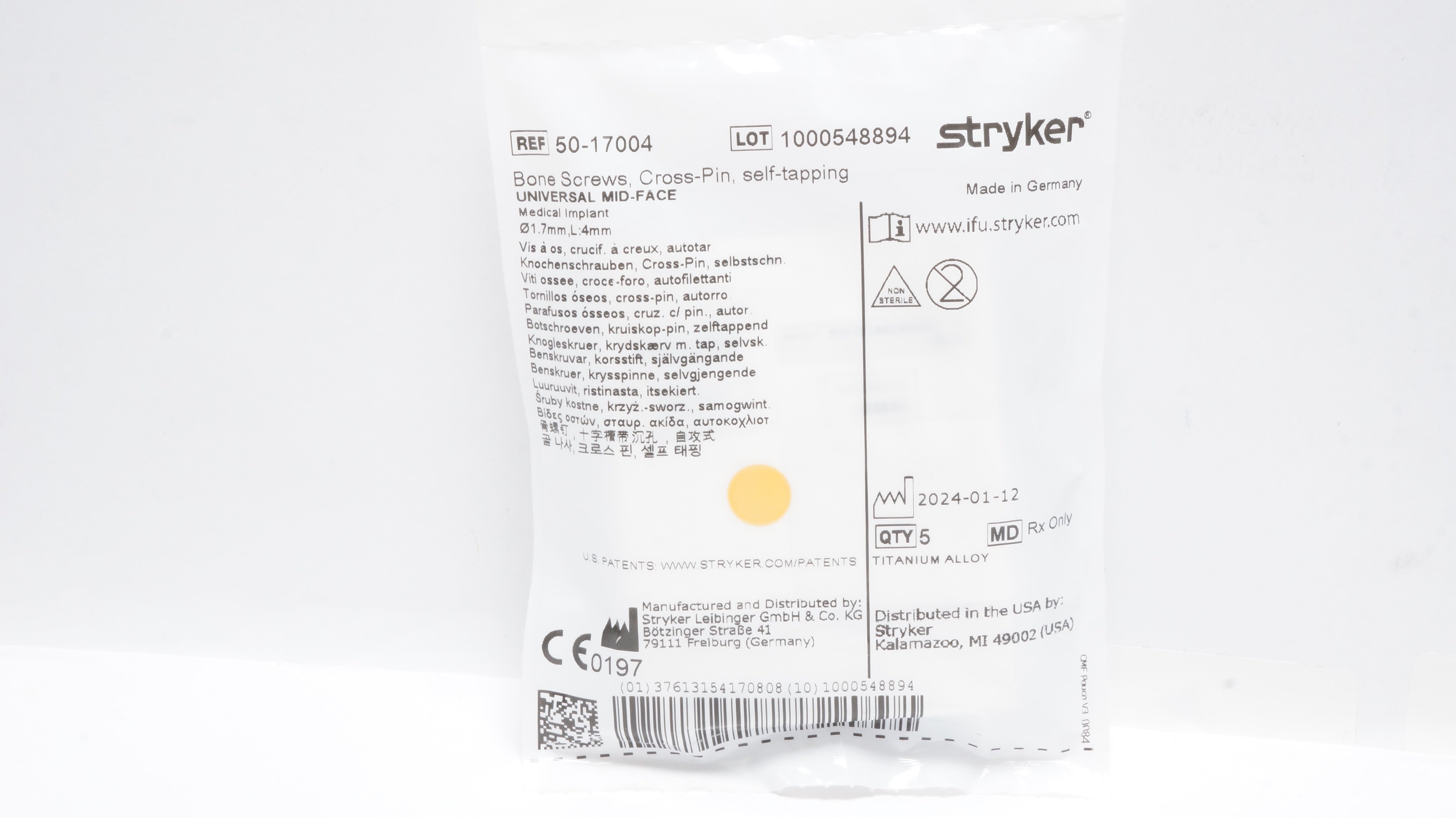 Stryker 50-17004 Bone Screws, Cross-Pin, Self-Tapping,, 1.7 x 4mm