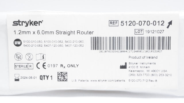 - Stryker 5120-070-012 1.2mm x 6.0mm Straight Router (x)