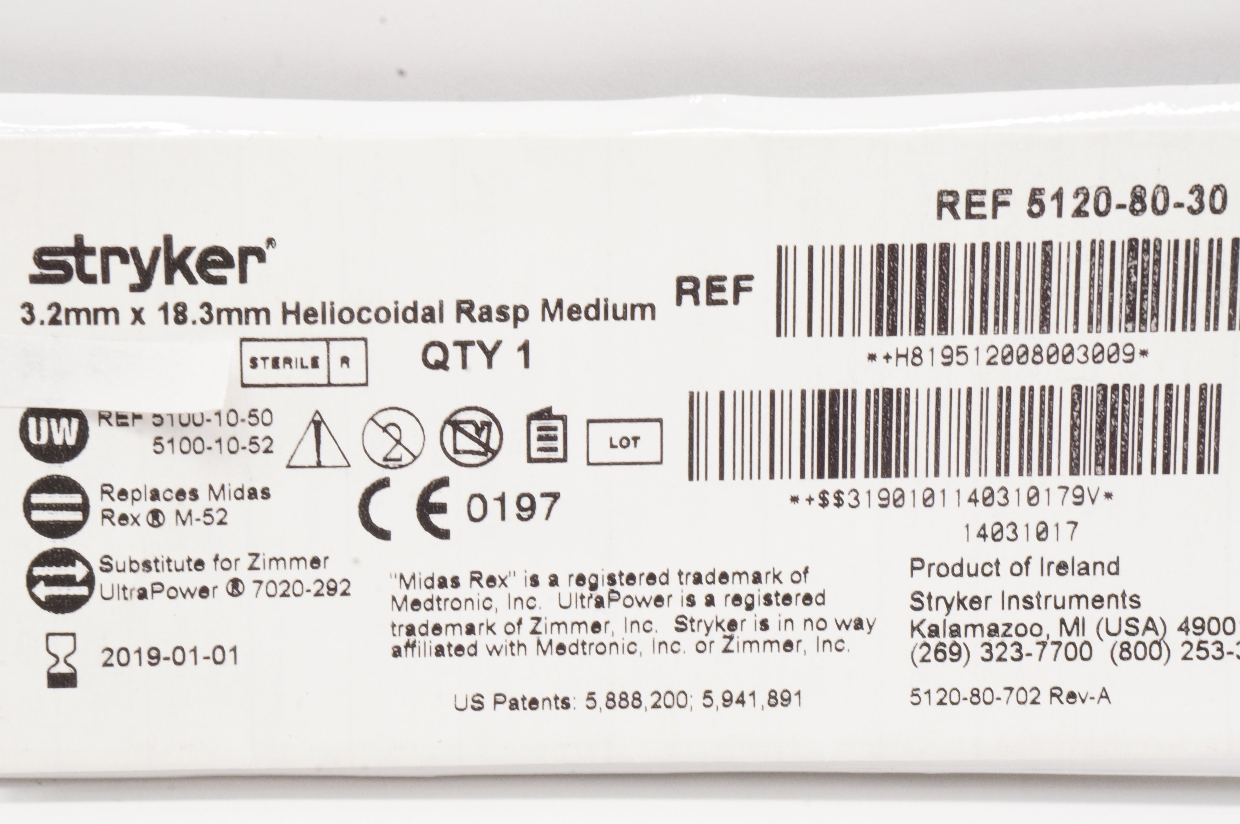 - Stryker 5120-80-30 Heliocoidal Rasp Medium 3.2mm x 18.3mm (x)