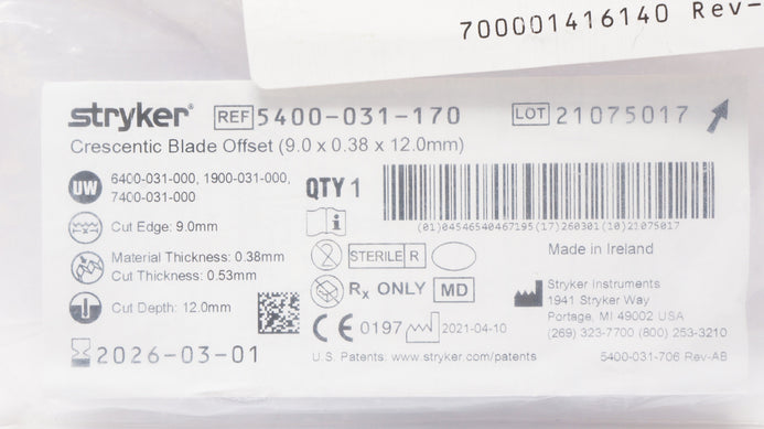 Stryker 5400-031-170 Crescentic Blade Offset 9.0mm x 0.38mm x 0.53mm x 12.0mm