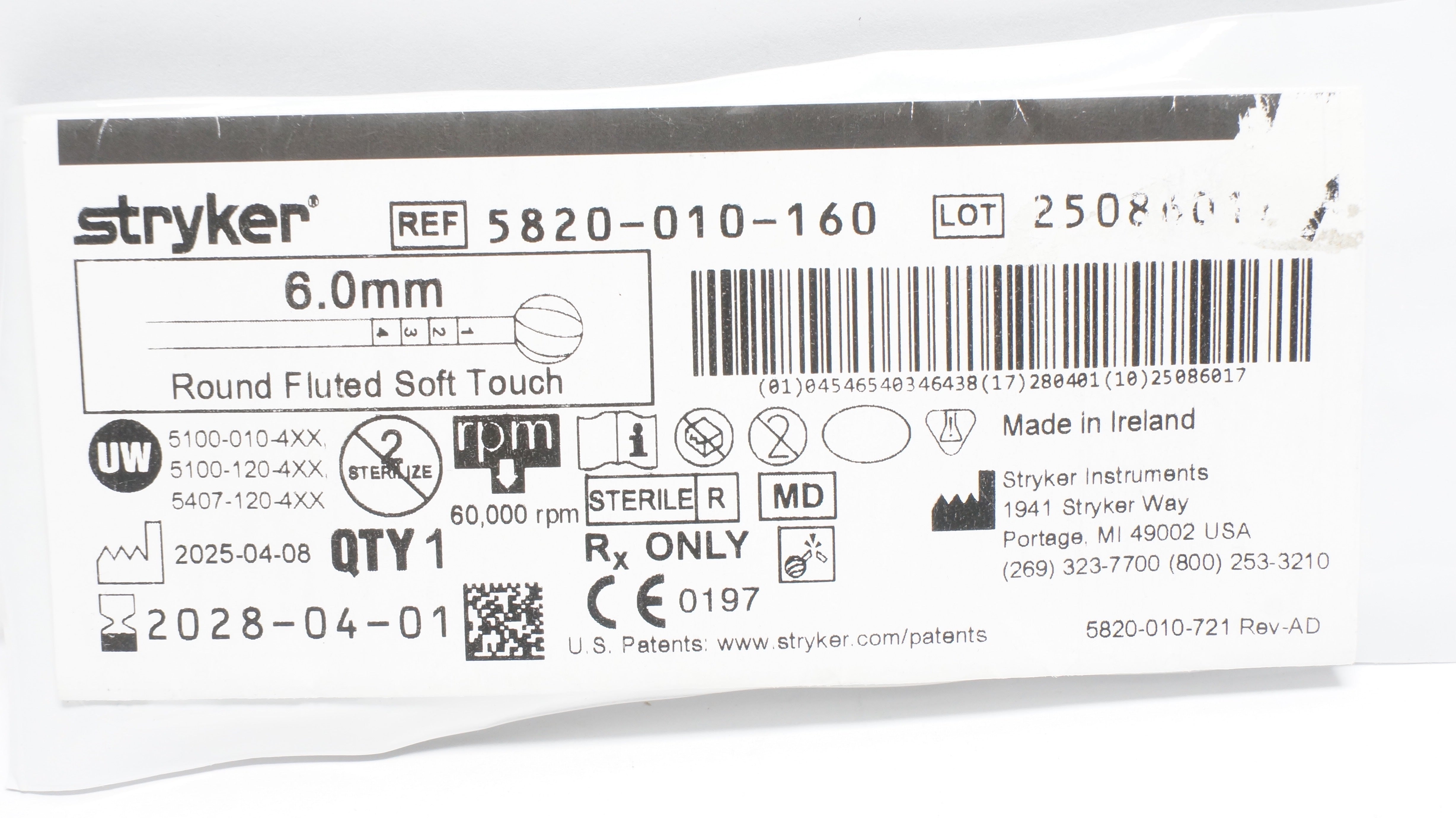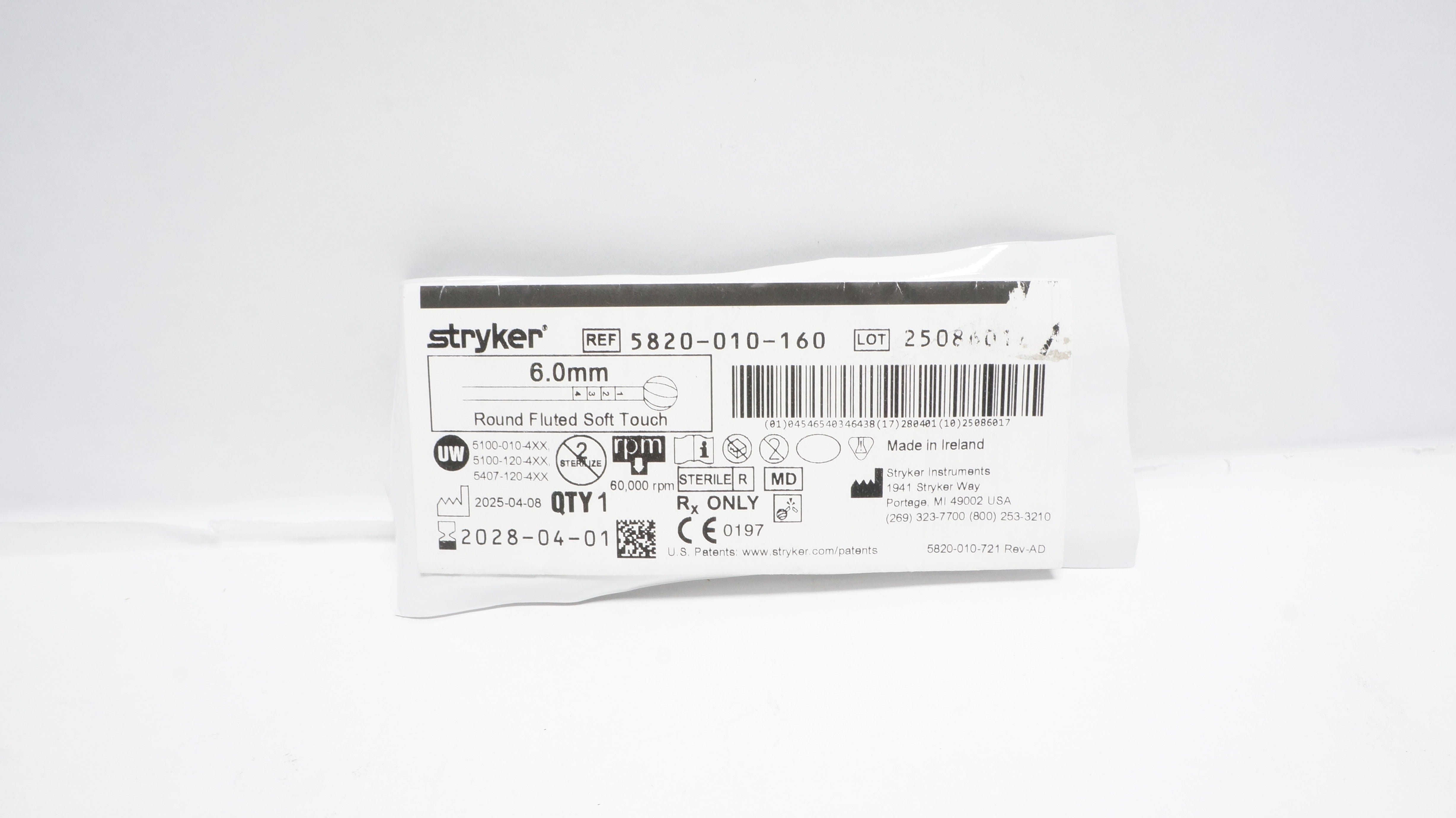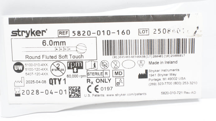 - Stryker 5820-010-160 6.0mm Round Fluted Bur Soft Touch