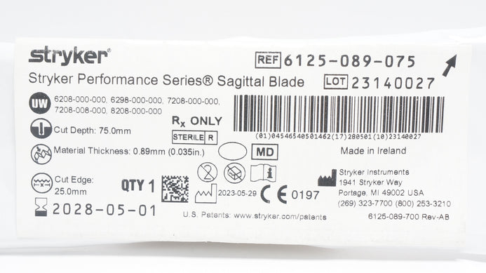 - Stryker 6125-089-075 Performance Series Sagittal Blade 0.89mm x 25.0mm