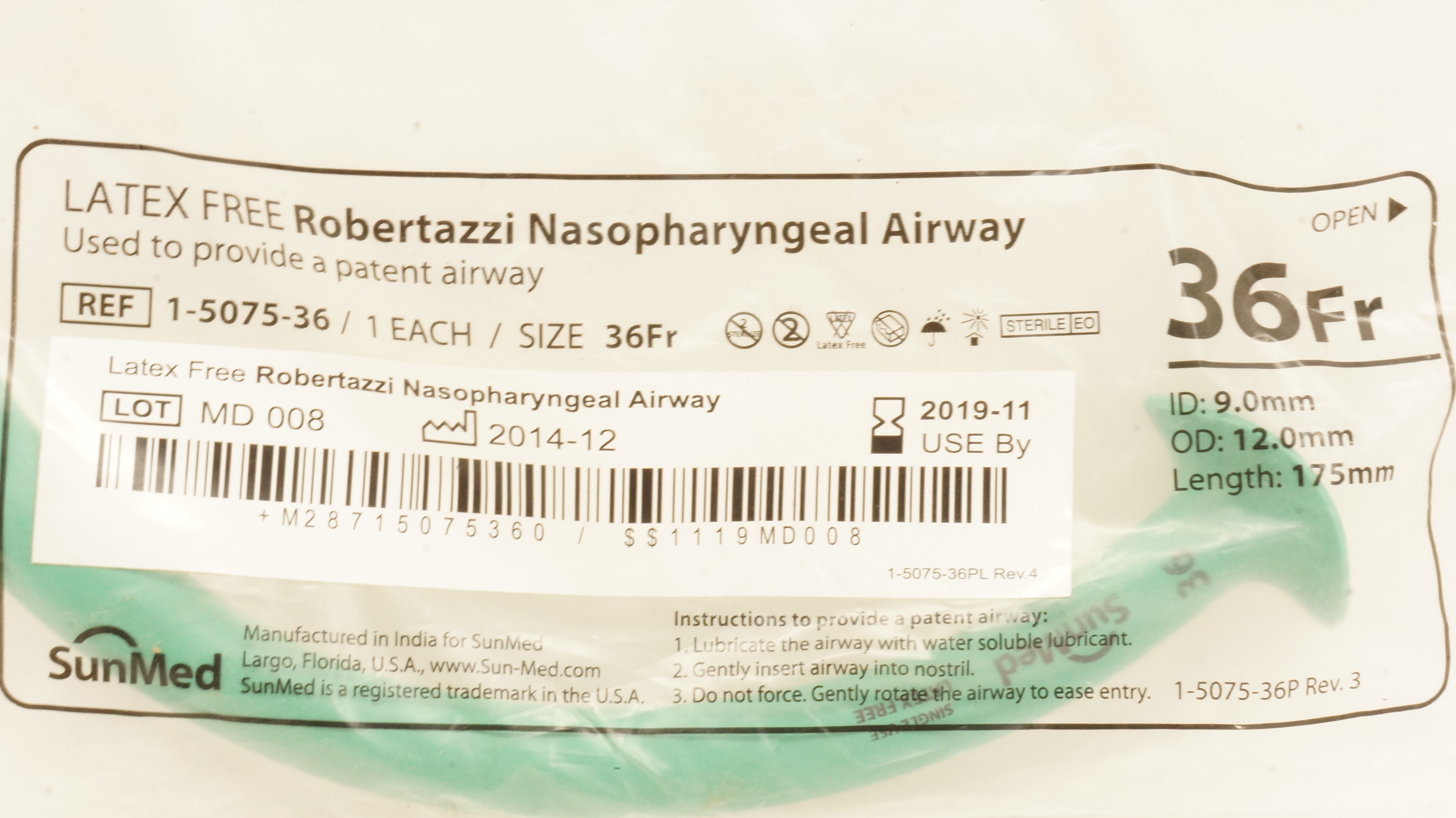SunMed 1-5075-36 Robertazzi Nasopharyngeal Airway 36Fr x 9.0mm ID x 12.0mm OD x 175mm