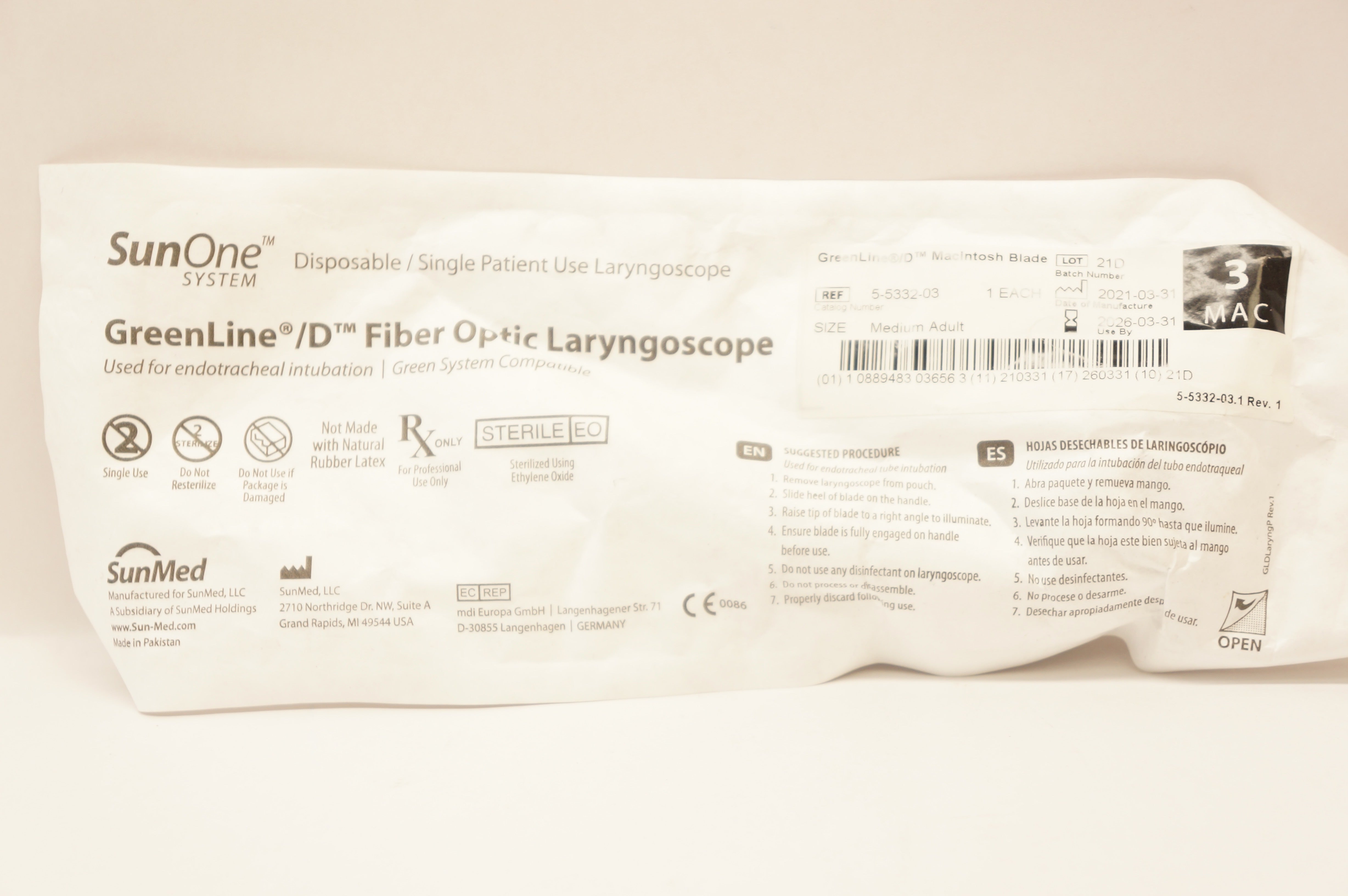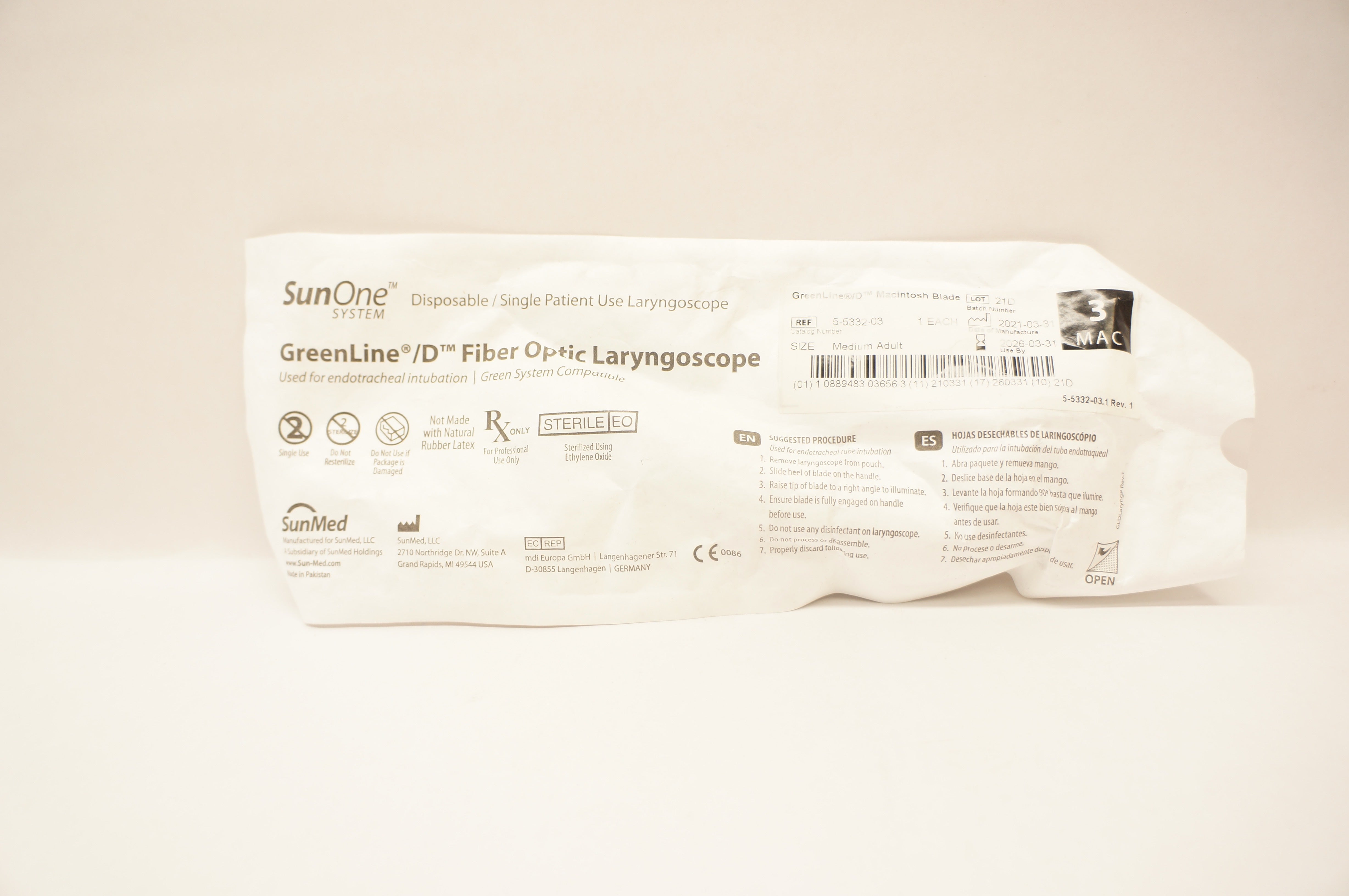 SunMed 5-5332-03 GreenLine/D Fiber Optic Laryngoscope, Size Medium Adult; Macintosh Blade, Size 3