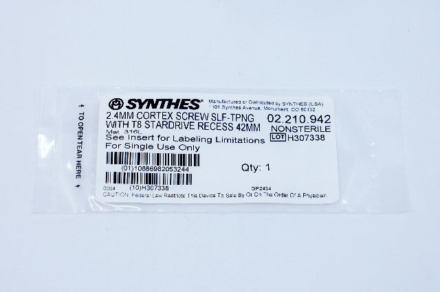 - Synthes 02.210.942 2.4mm Cortex Screw Self-Tapping With T8 Stardrive Recess 42mm