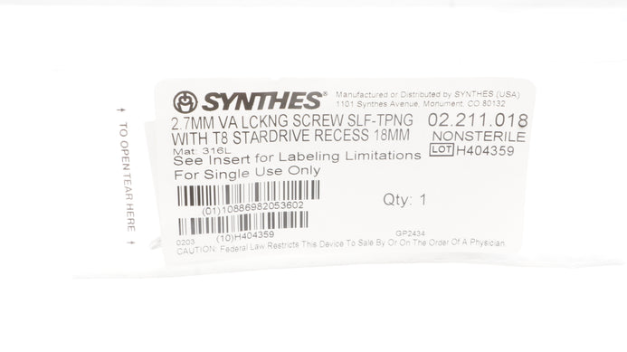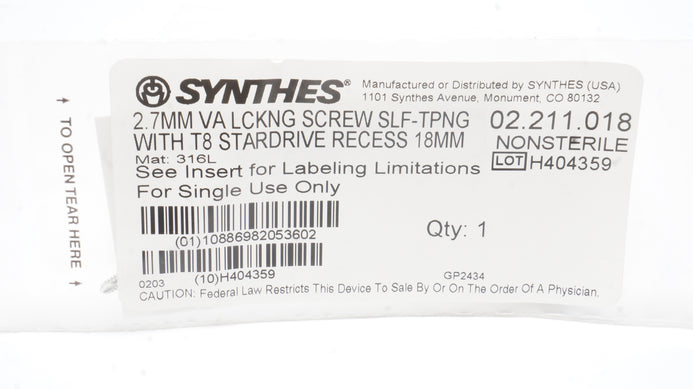 - Synthes 02.211.018 2.7mm VA LCKNG Screw Self-Tapping w/T8 Stardrive Recess 18mm