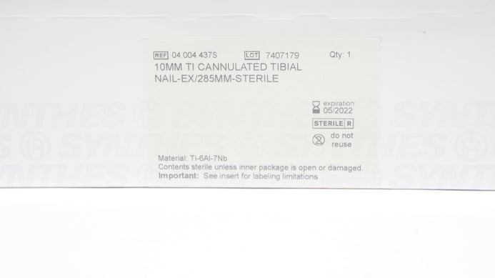 - Synthes 04.004.437S 10mm TI CANNULATED TIBIAL NAIL-EX/285mm-Sterile (x)