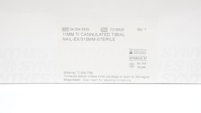 - Synthes 04.004.543S 11mm TI CANNULATED TIBIAL NAIL-EX/315mm-Sterile (x)