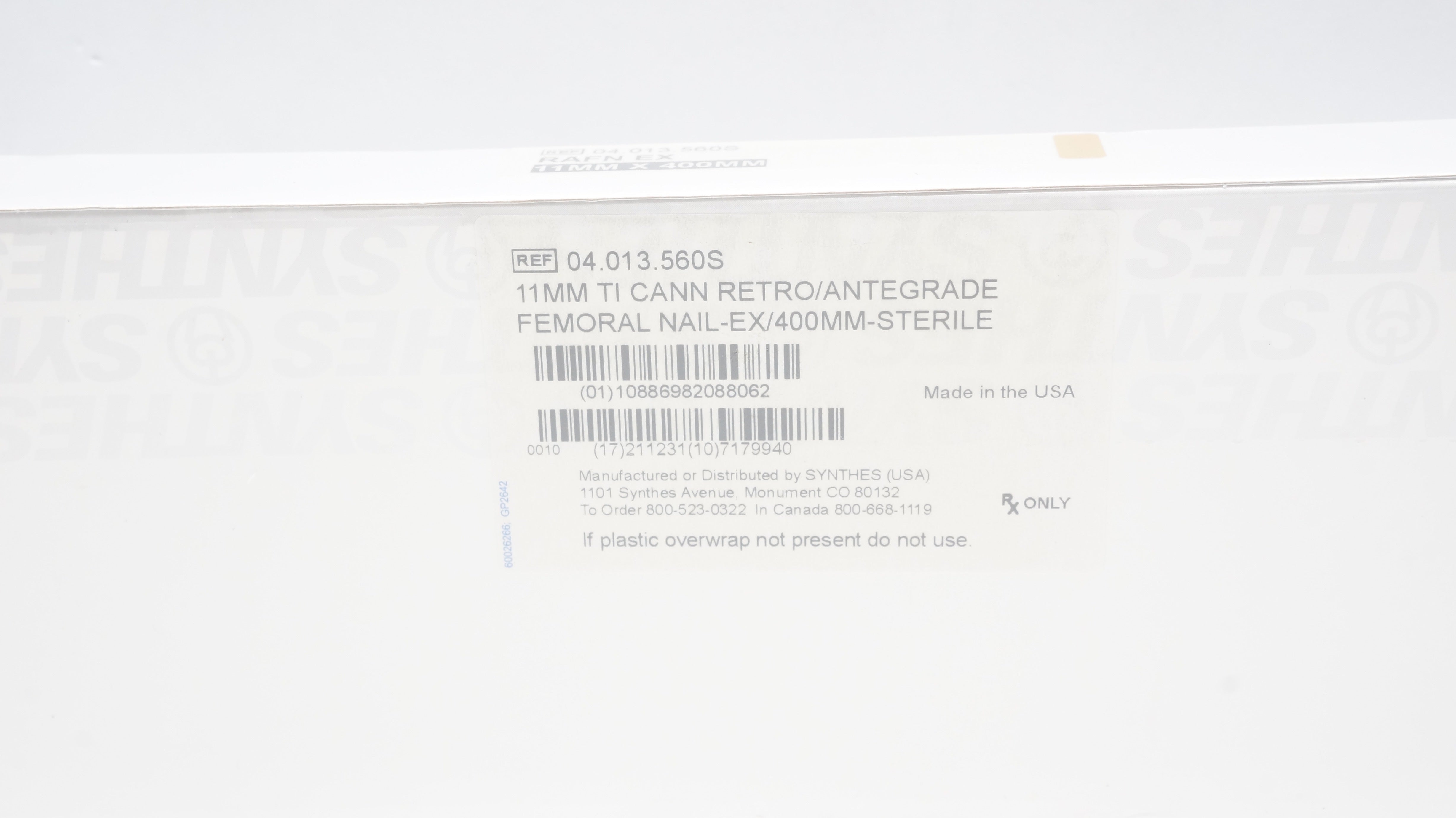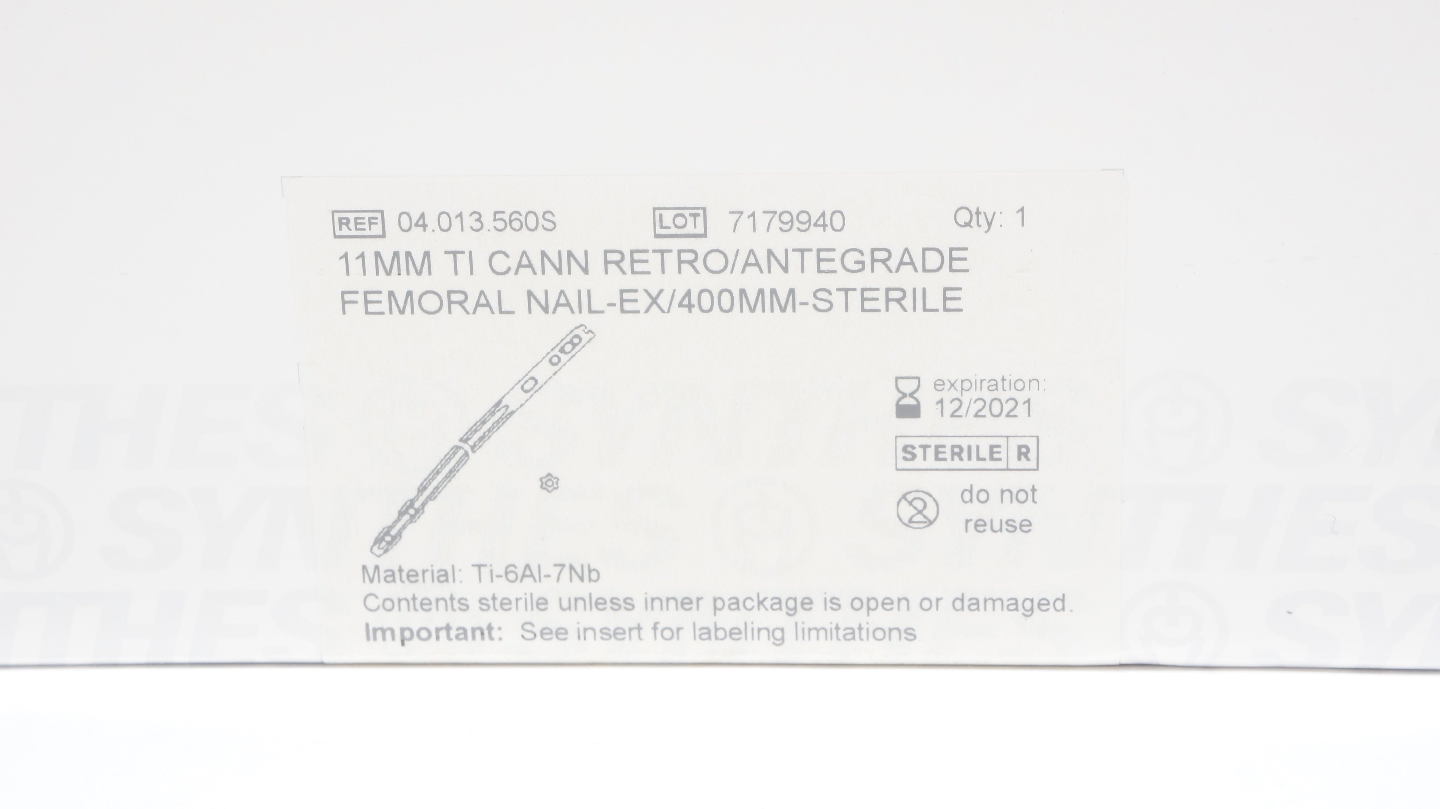 - Synthes 04.013.560S 11mm TI CANN RETRO/ANTEGRADE FEMORAL NAIL-EX/400mm (x)