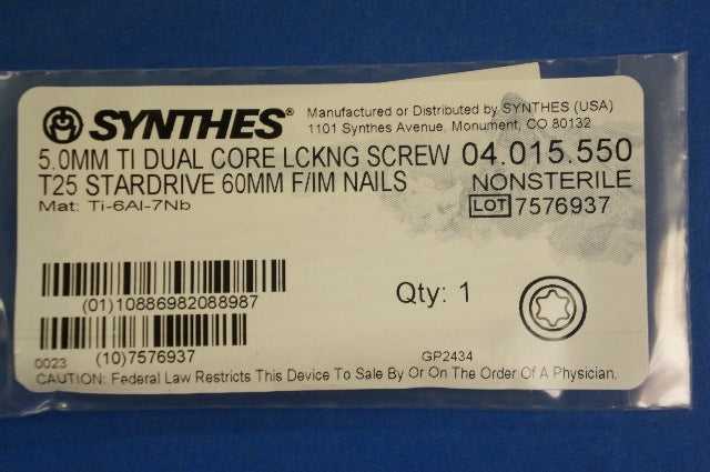 - Synthes 04.015.550 5.0mm Ti Dual Core Lckng Screw T25 Stardrive 60mm F/IM Nails