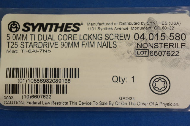 Synthes 04.015.580 5.0mm Ti Dual Core Lckng Screw T25 Stardrive 90mm F/IM Nails