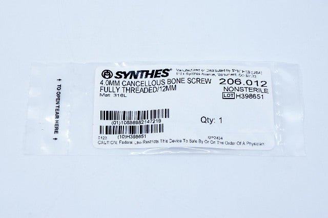 - Synthes 206.012 4.0mm Cancellous Bone Screw Fully Threaded 12mm