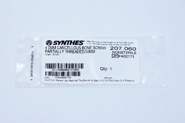 - Synthes 207.060 4.0mm Cancellous Bone Screw Partially Threaded 60mm