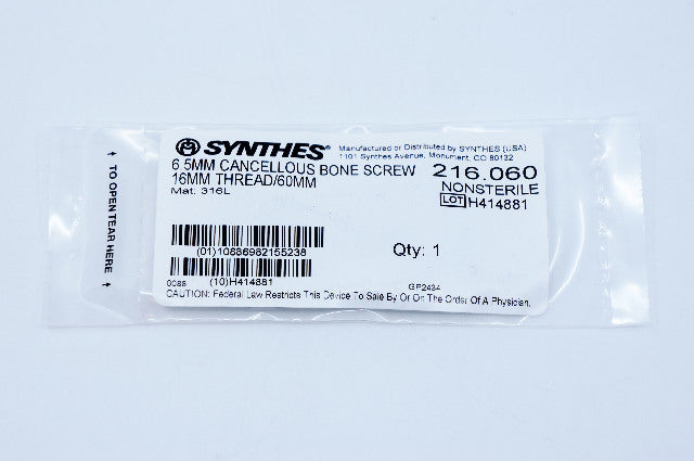 - Synthes 216.060 6.5mm Cancellous Bone Screw 16mm Thread/60mm