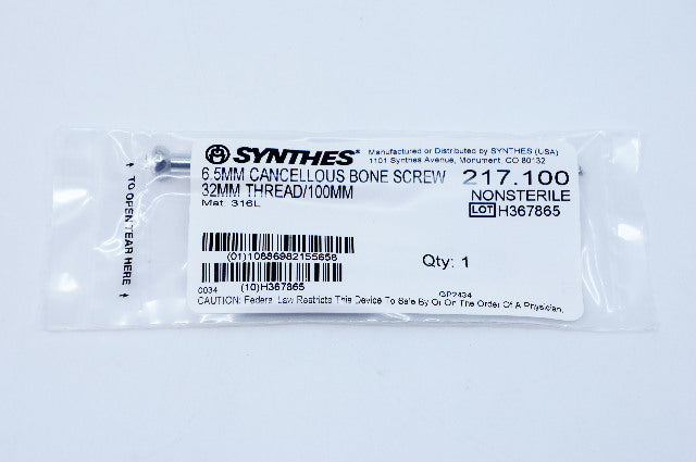- Synthes 217.100 6.5mm Cancellous Bone Screw 32mm Thread/100mm