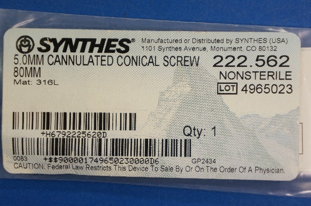 Synthes 222.562 5.0mm Cannulated Conical Screw 80mm