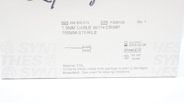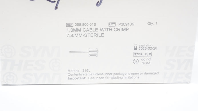 - Synthes 298.800.01S 1.0mm Cable with Crimp 750mm Sterile (x)