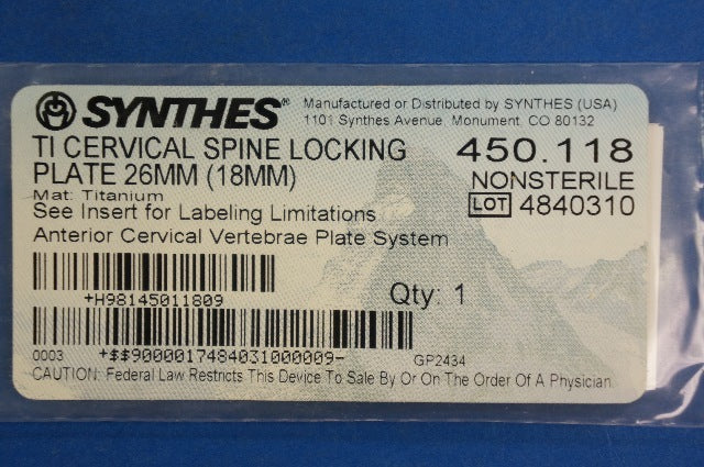 - Synthes 450.118 Ti Cervical Spine Locking Plate 26mm (18mm)