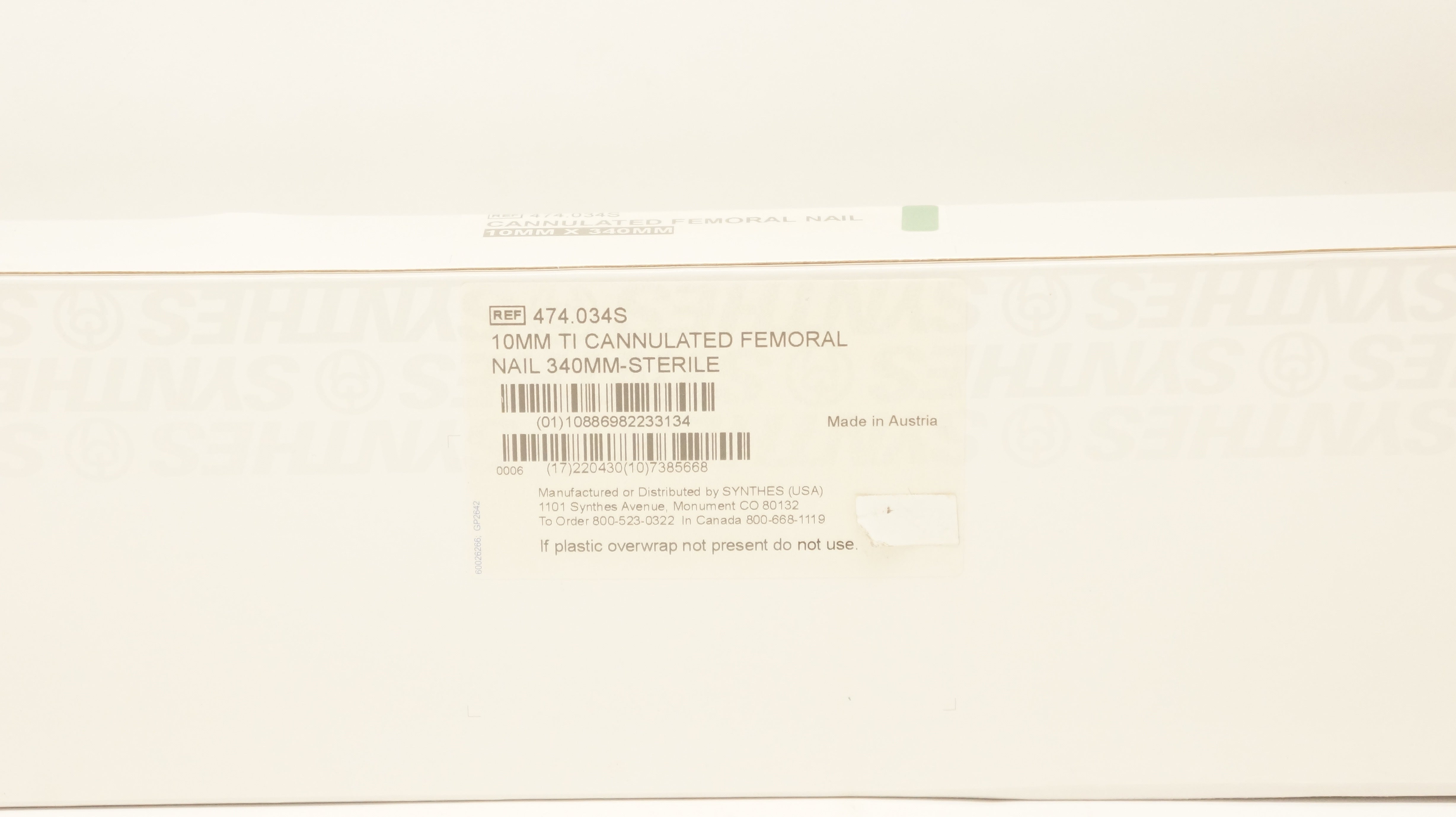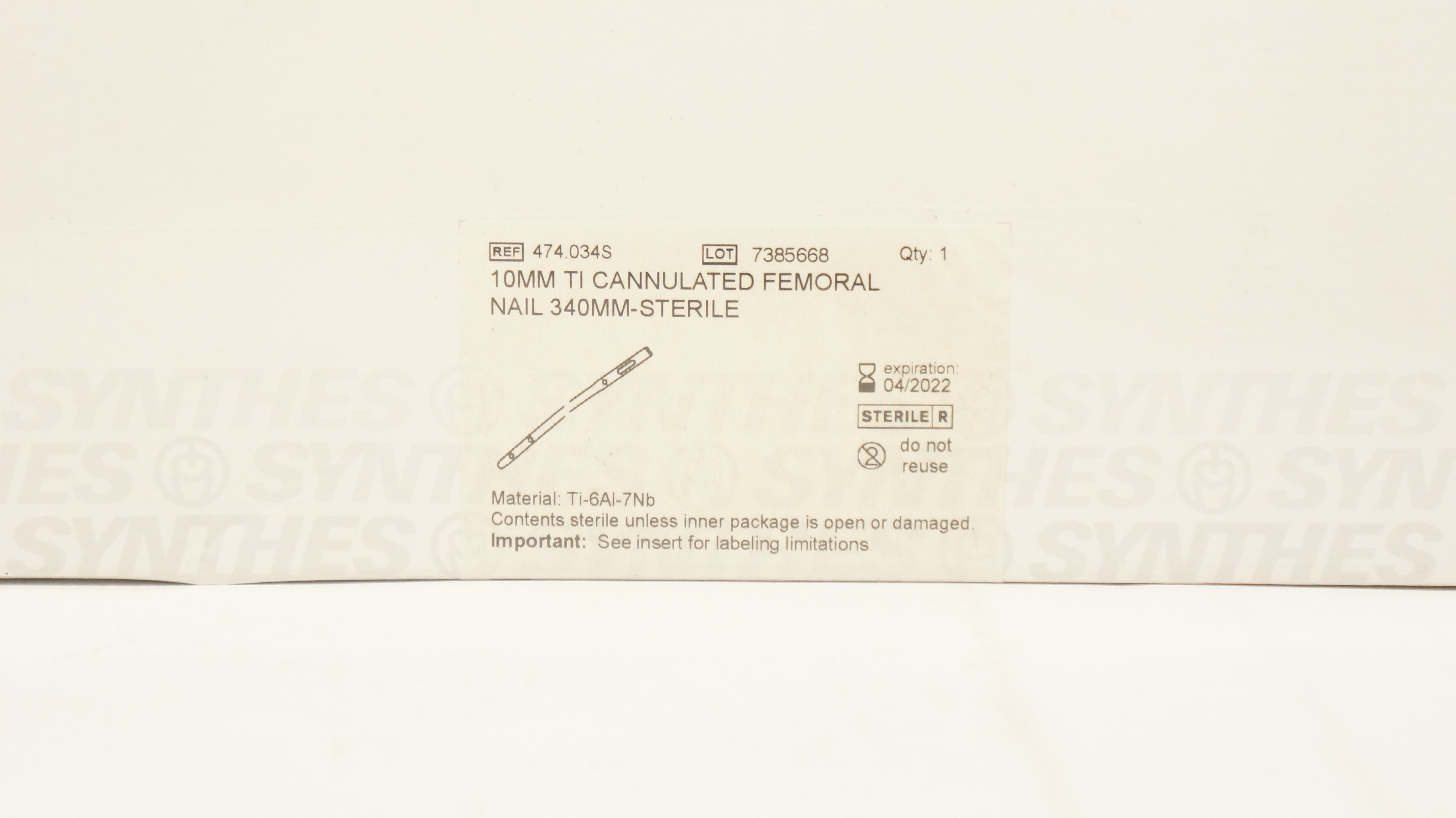 - Synthes 474.034S 10mm Ti Cannulated Femoral Nail 340mm