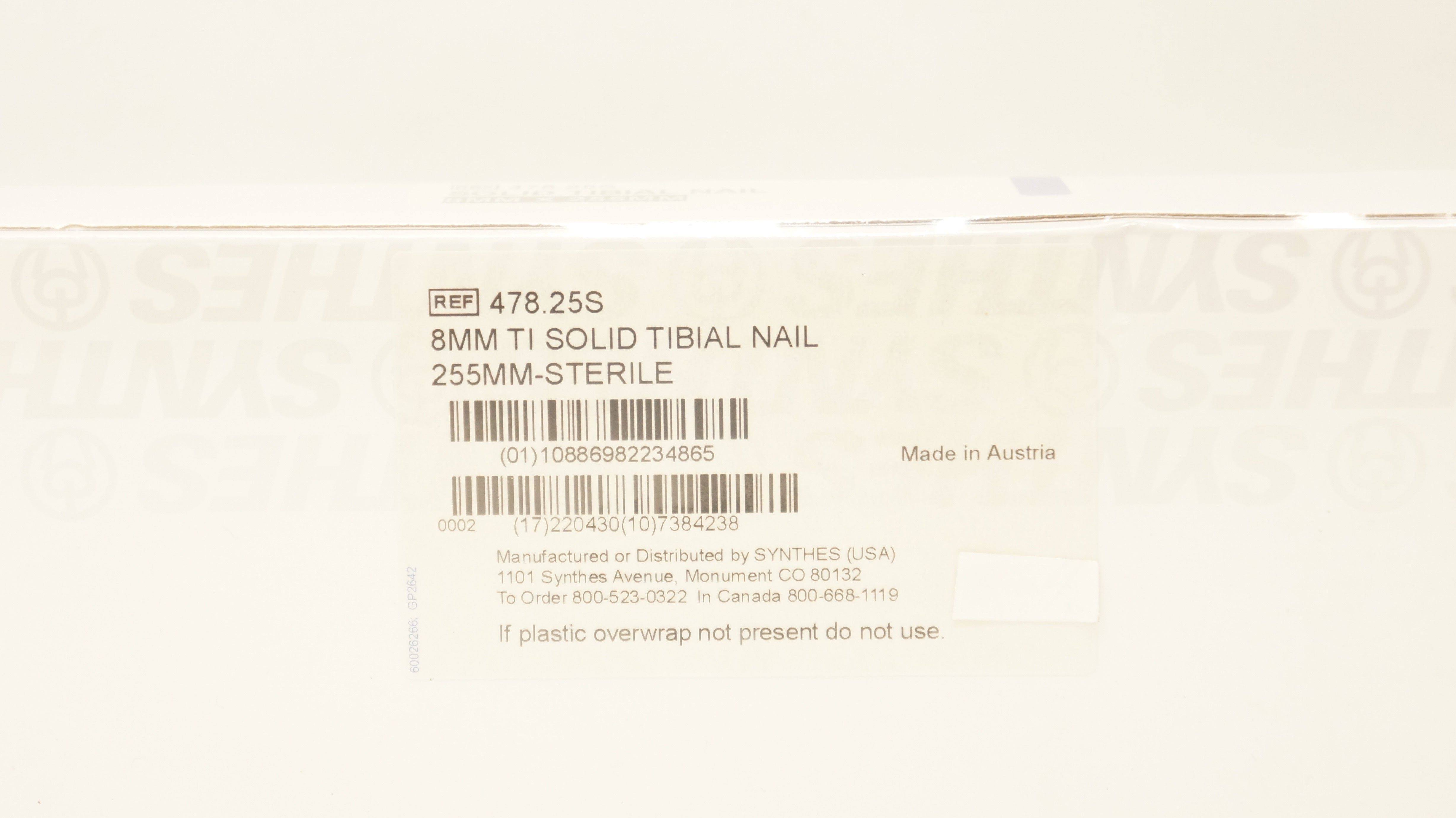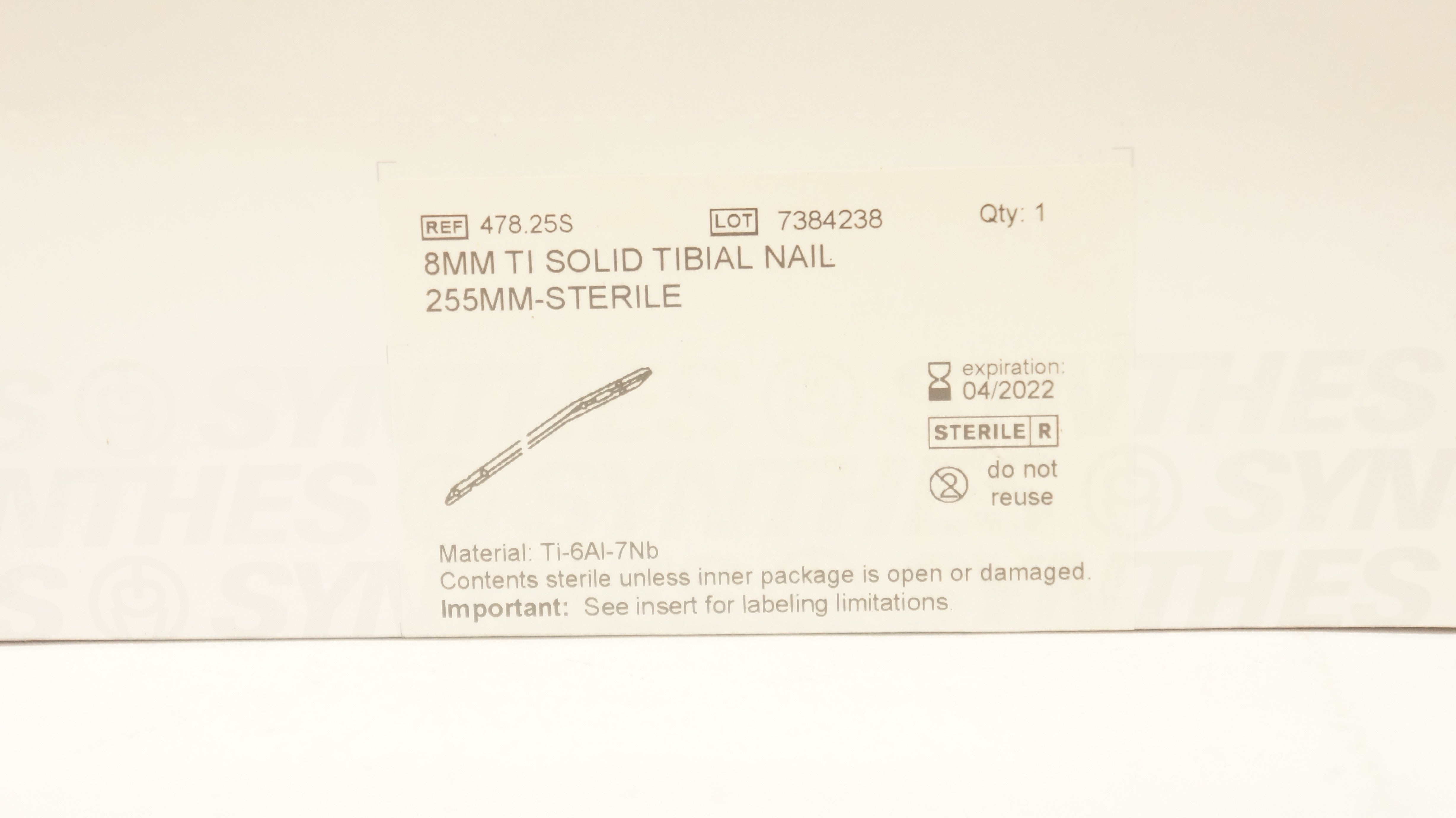 - Synthes 478.25S 8mm Ti Solid Tibial Nail 255mm