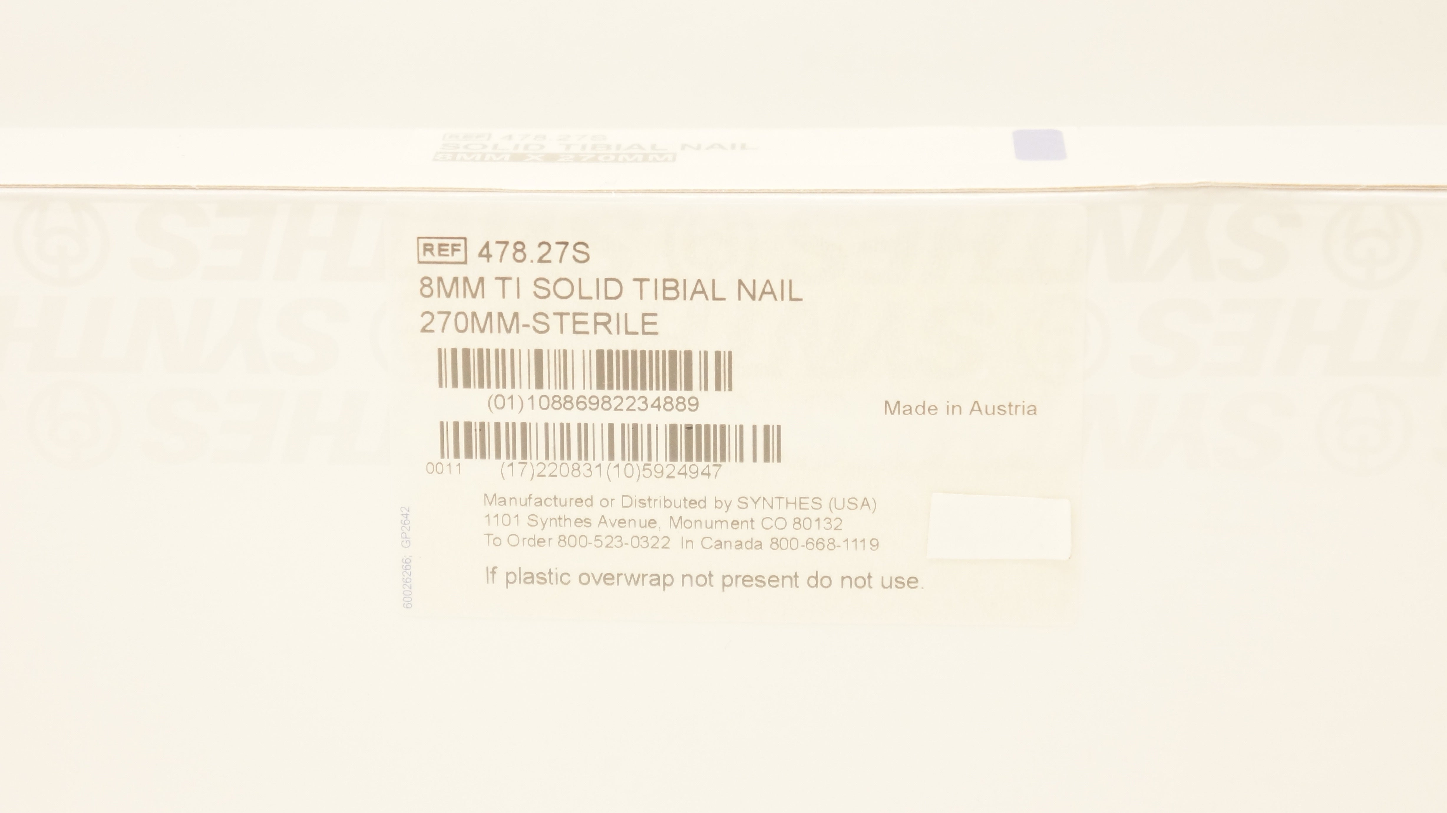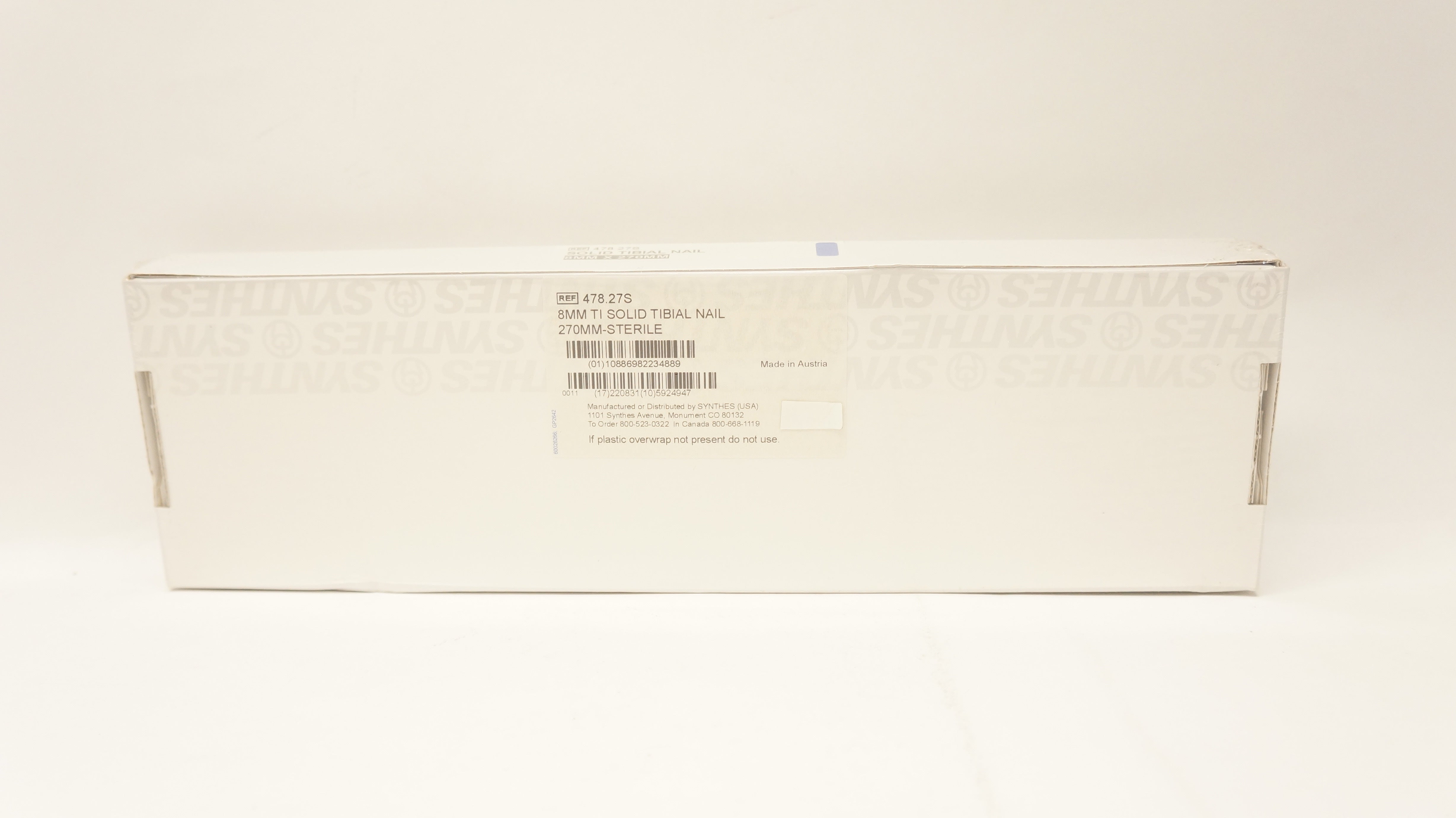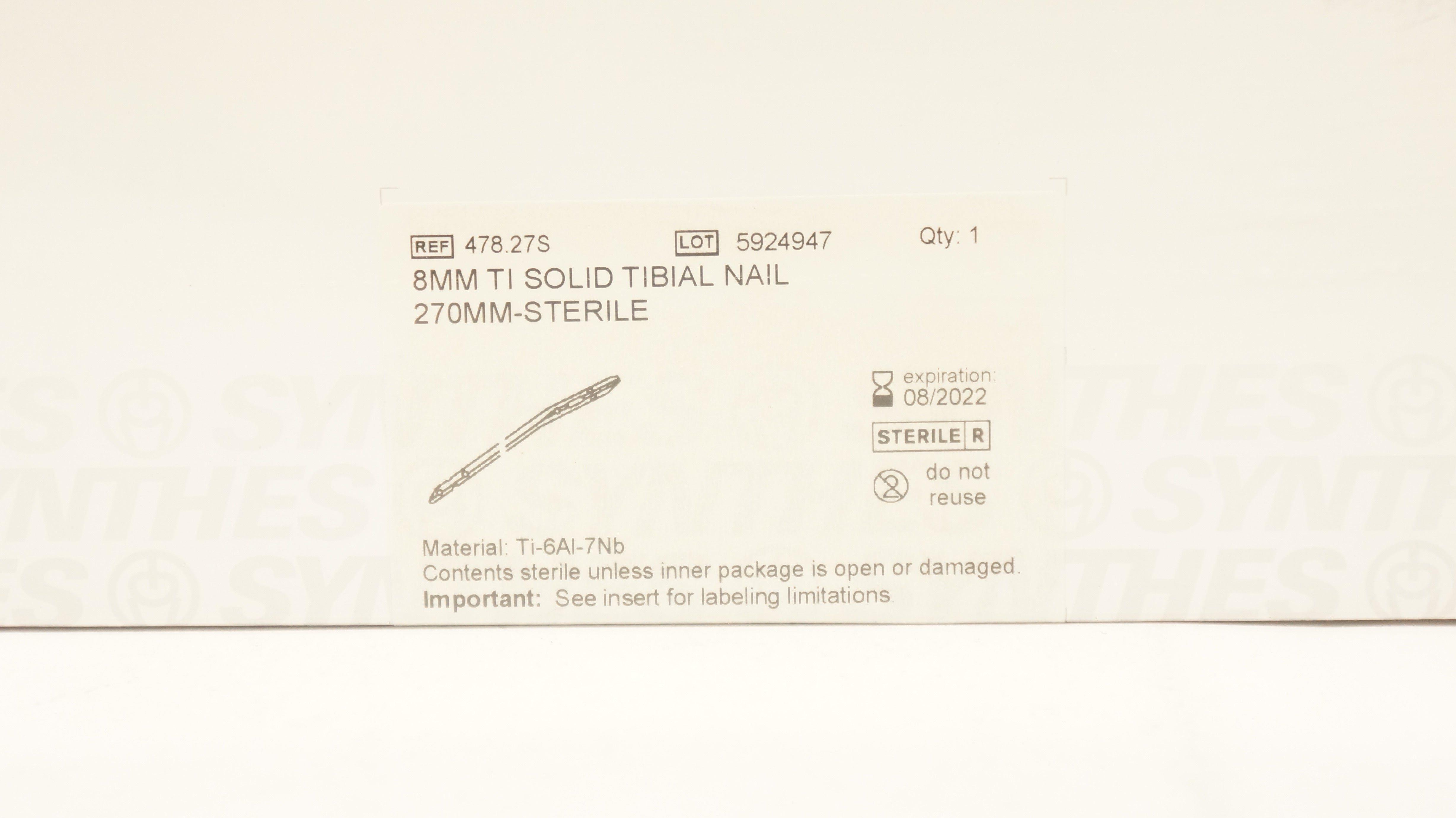 Synthes 478.27S 8mm Ti Solid Tibial Nail 270mm