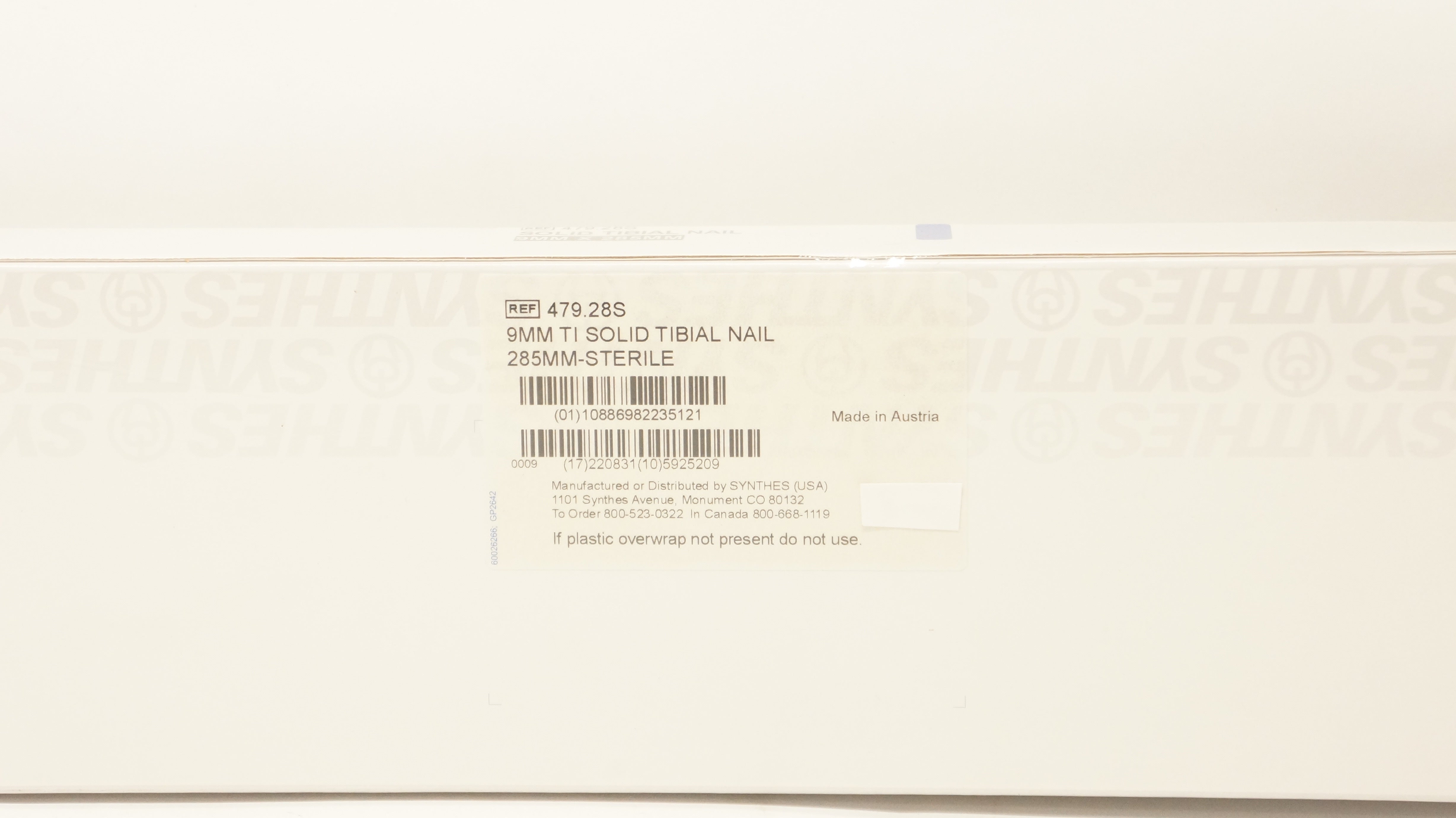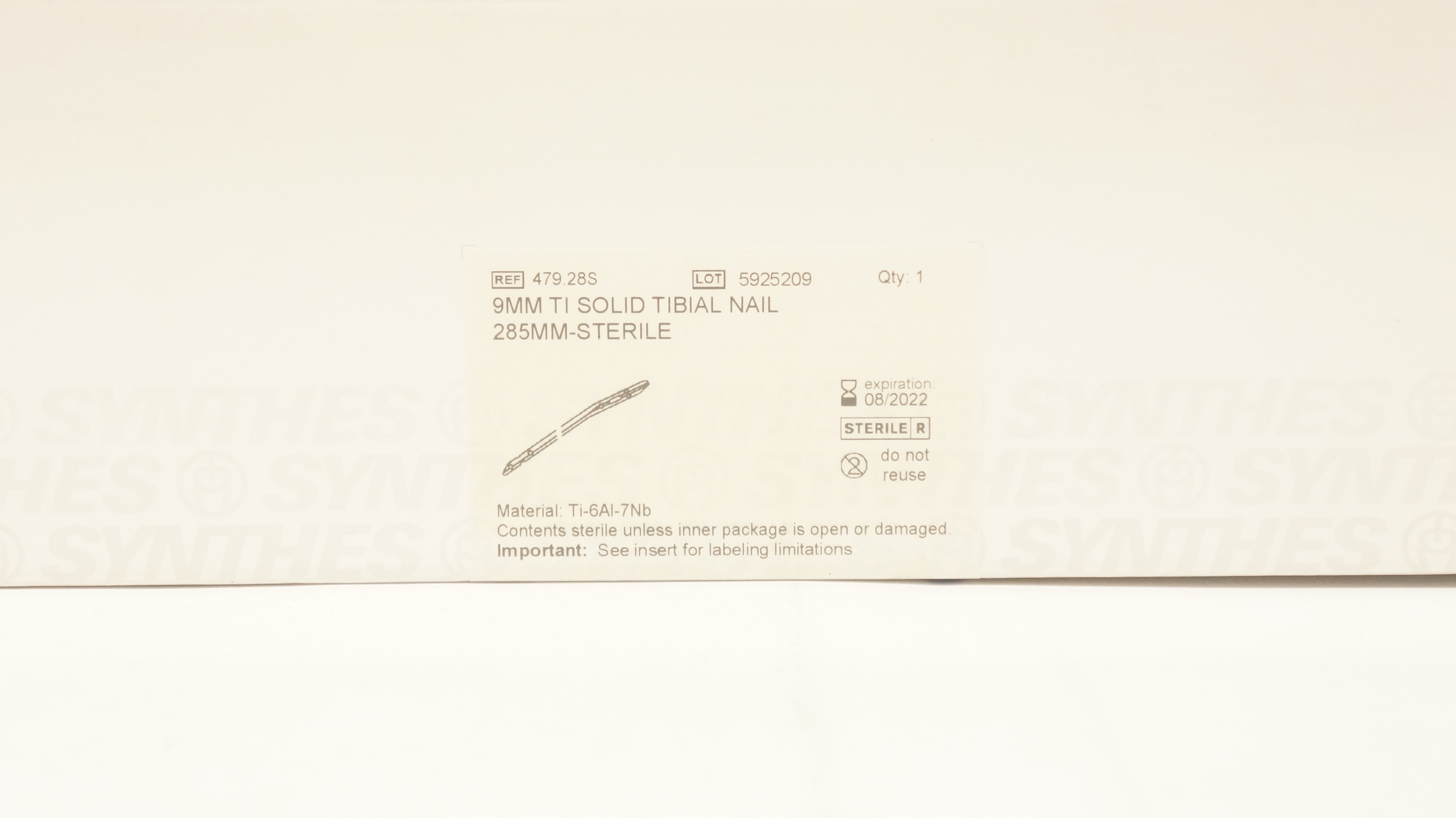 Synthes 479.28S 9mm Ti Solid Tibial Nail 285mm