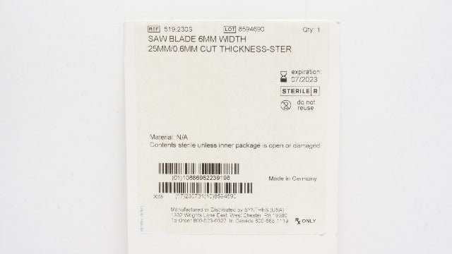 - Synthes 519.230S Saw Blade 6mm Width 25mm/0.6mm Cut Thickness-Ster (x)