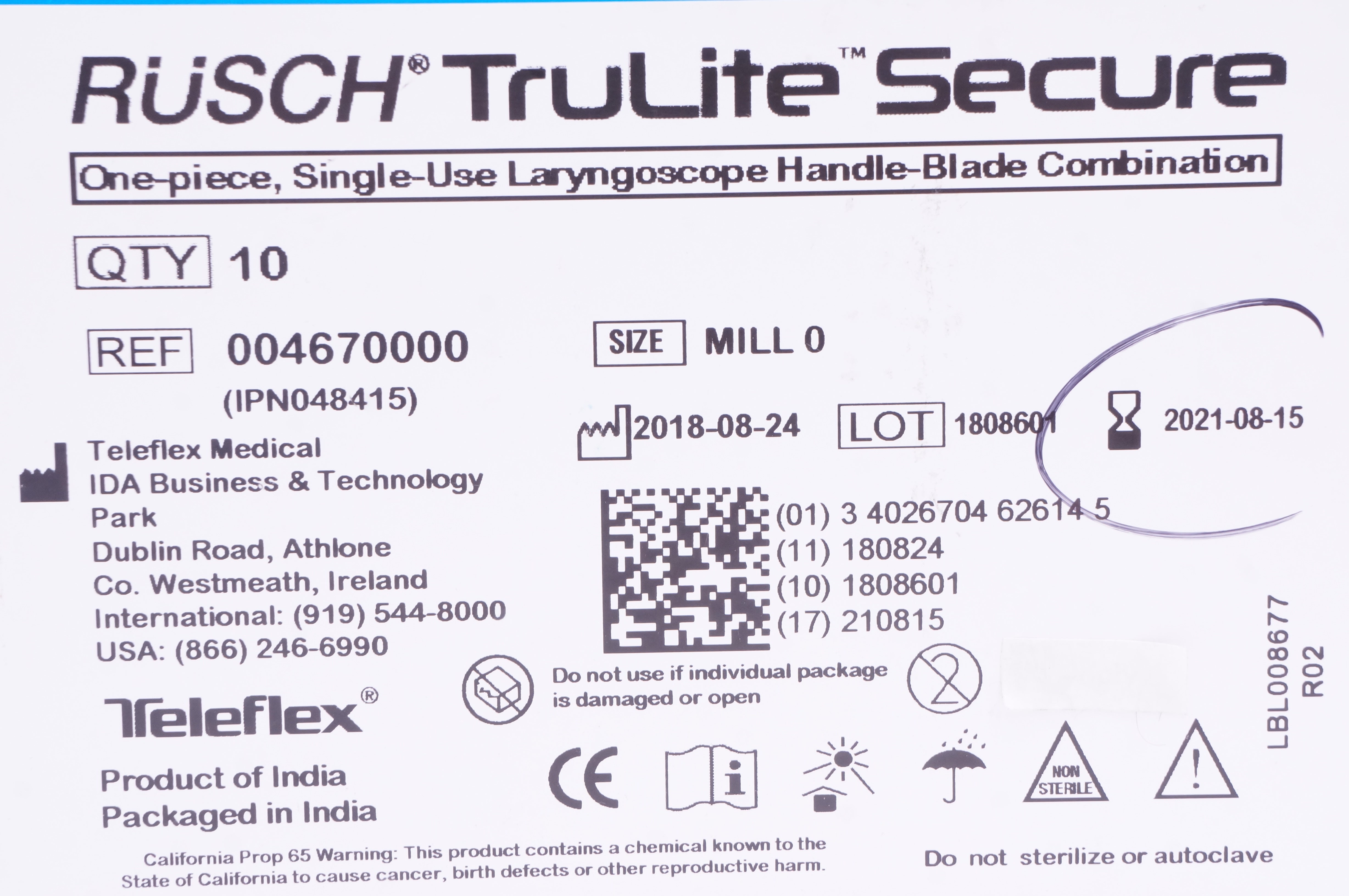 - Teleflex 004670000 Rusch TruLite Secure Laryngoscope Handle-Blade Mill 0-Boxof10