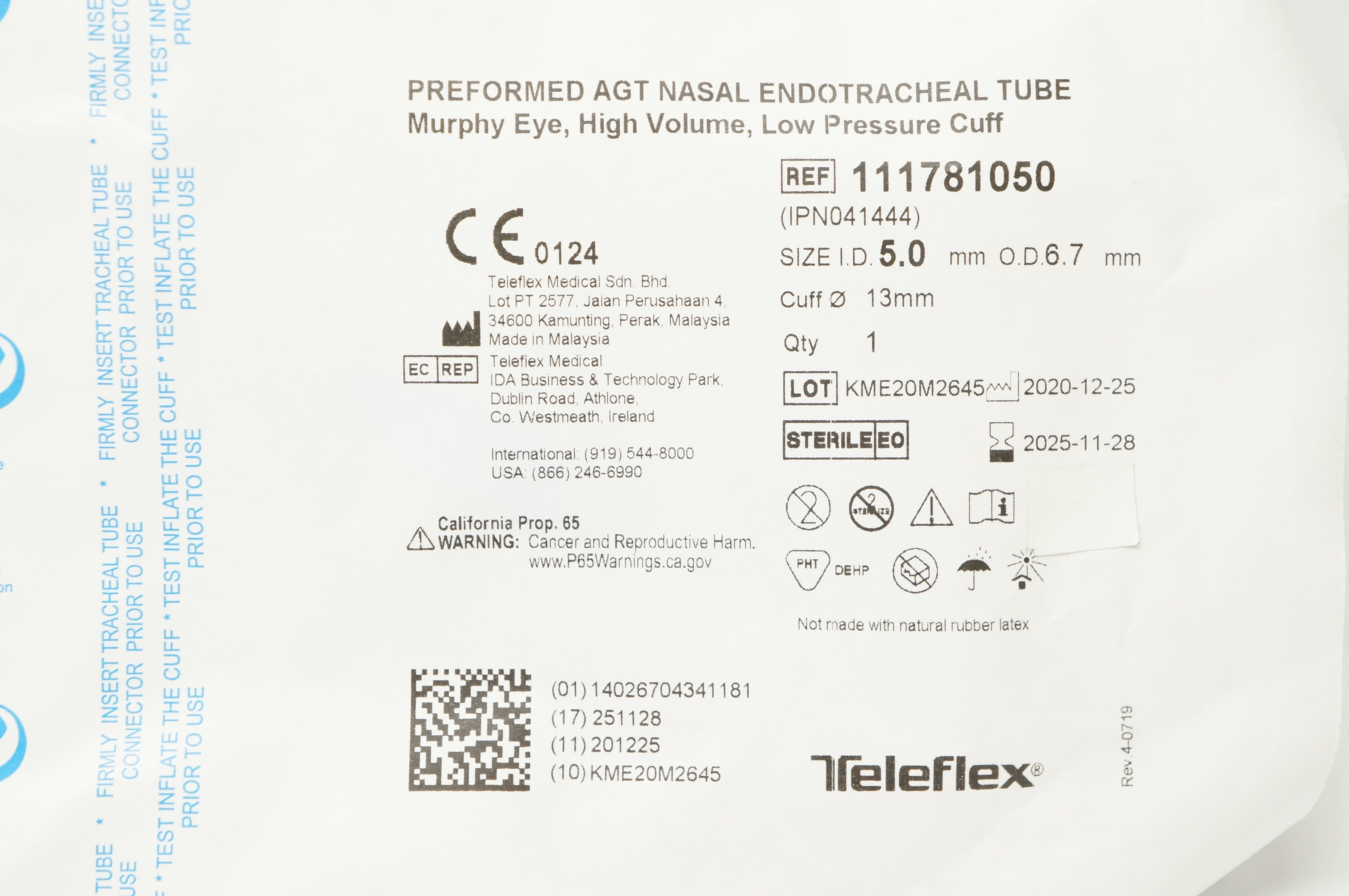 - Teleflex 111781050 Preformed AGT Nasal Endotracheal Tube 5.0mm