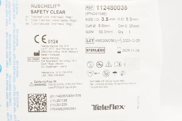 Teleflex 112480035 Ruschelit Safety Clear Tracheal Tube 3.5mm ID x 5.3mm OD