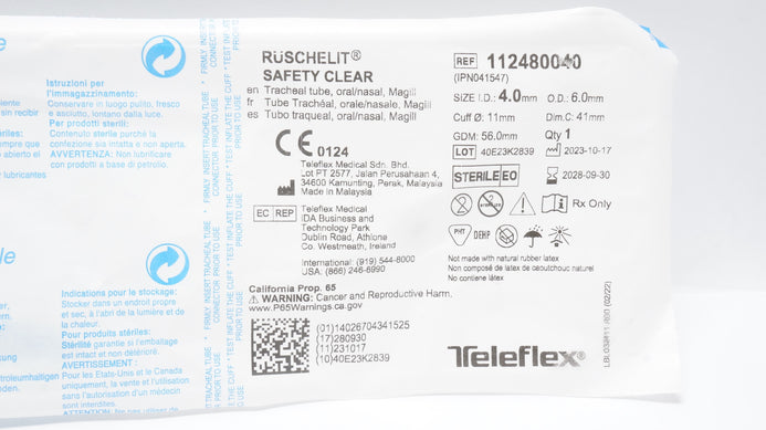 - Teleflex 112480040 Ruschelit Safety Clear Tracheal Tube 4.0mm ID x 6.0mm OD