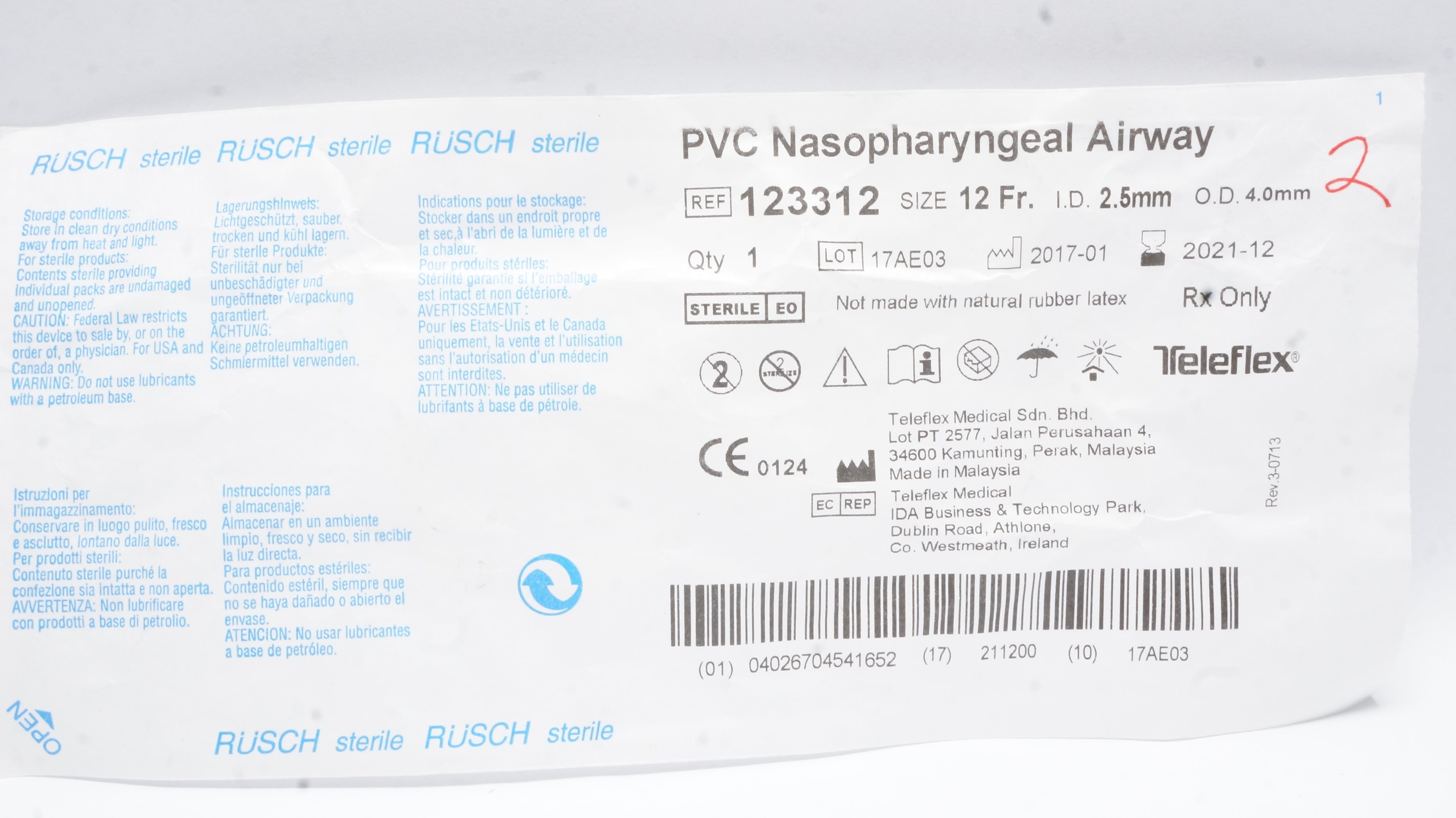 - Teleflex 123312 PVC Nasopharyngeal Airway 12Fr x 2.5mm I.D. x 4.0mm O.D. (x)